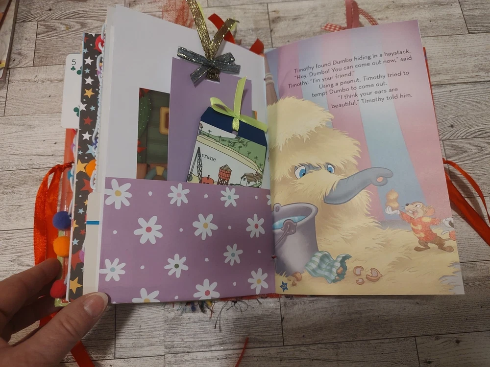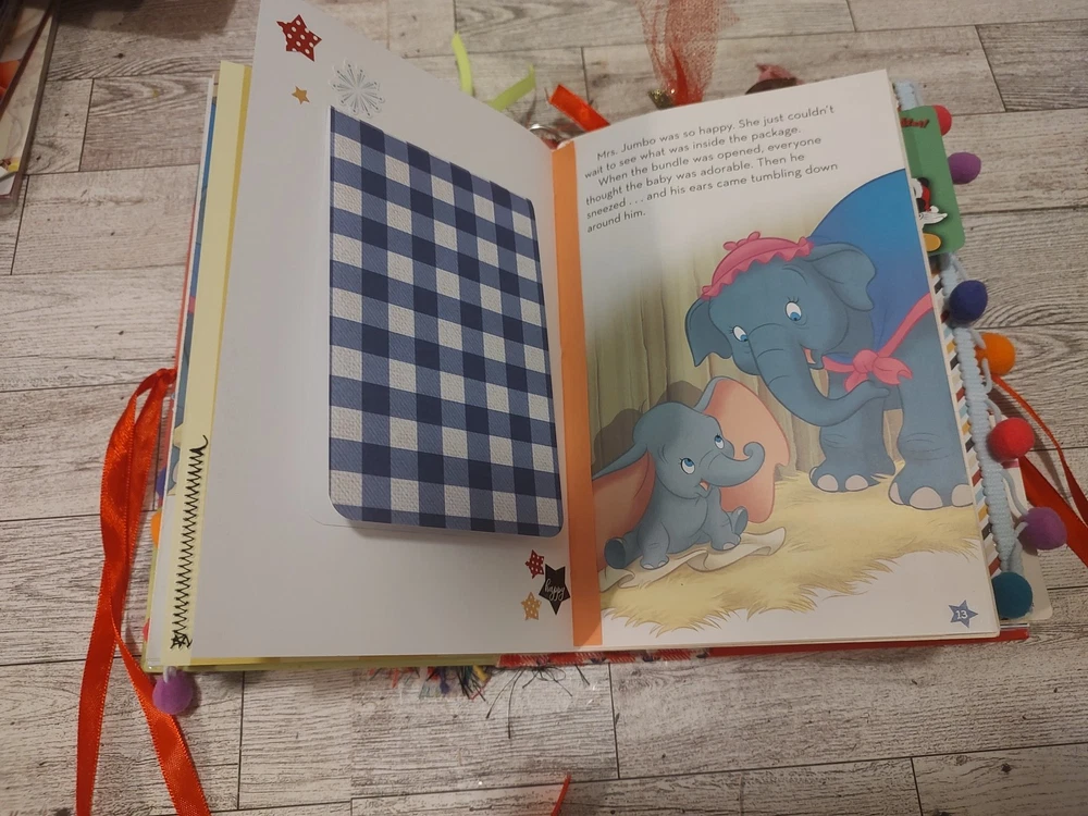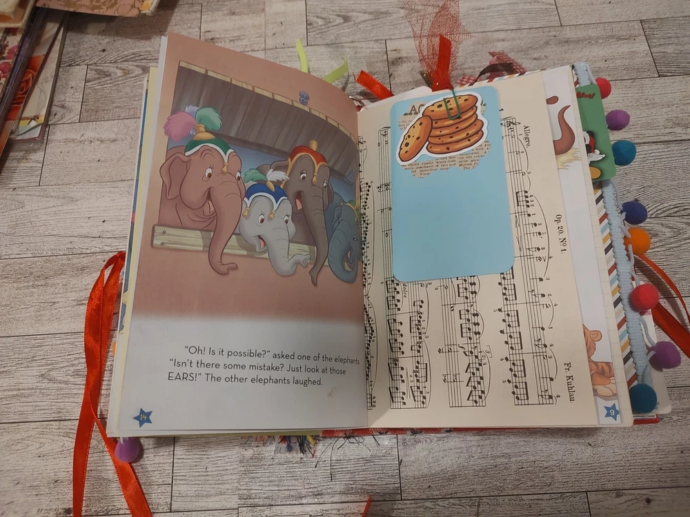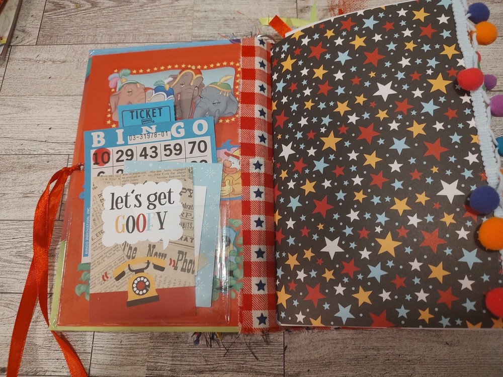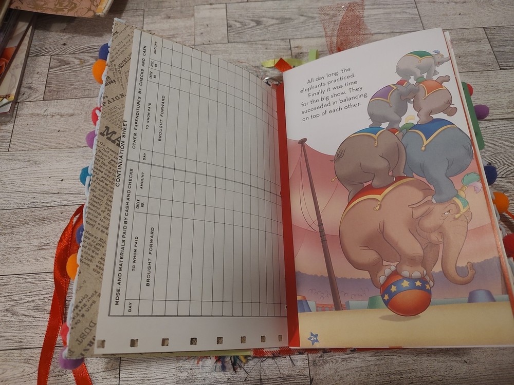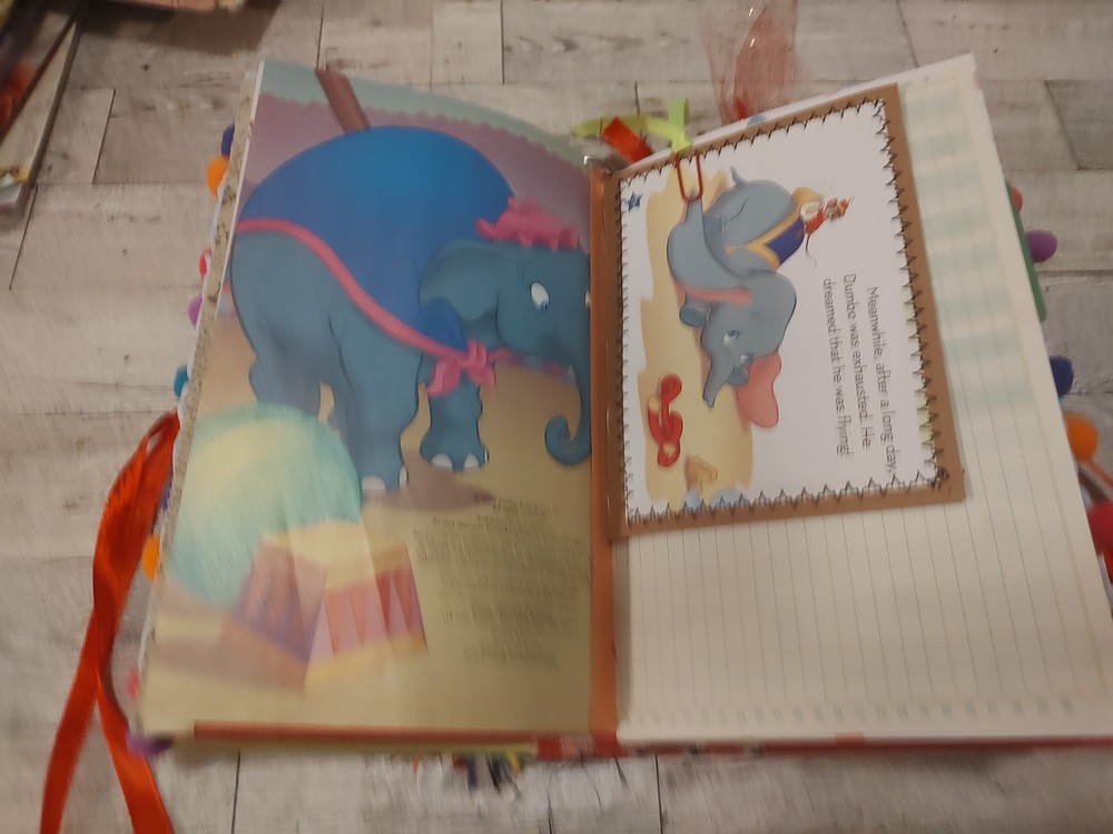 This journal is handmade from a vintage Disney Dumbo hardcover book, the pages are from scrapbook paper and papers that I have thrifted. It is also packed with lots of handmade ephemera and the pages from the original book as well as vintage ephemera. This journal is approximately 5 3/4 inches wide, it is about 8 3/4 in tall, it has a 1 1/2 inch spine and 2 signatures. It has approximately 40 pages or 80 surfaces for you to use as you wish. Thank you! I always combine shipping in case you want something else from my shop, thank you! You can just make your purchases and then I will refund any postal overag