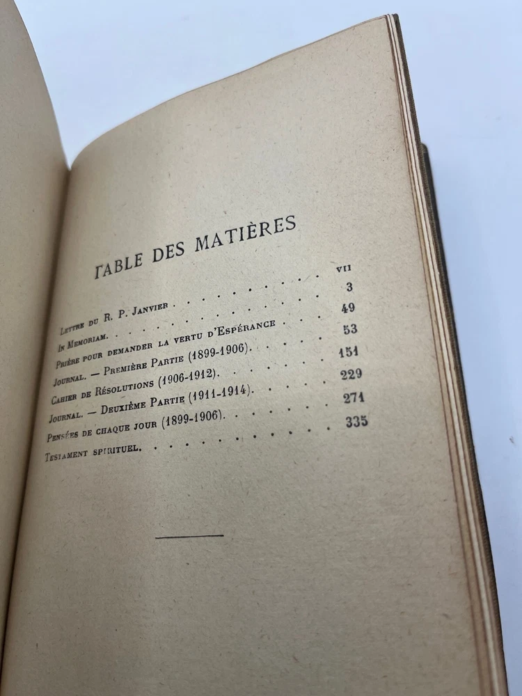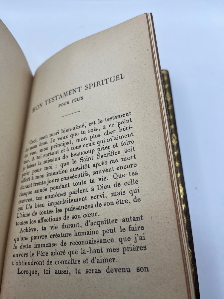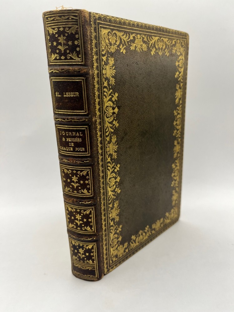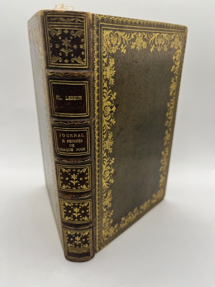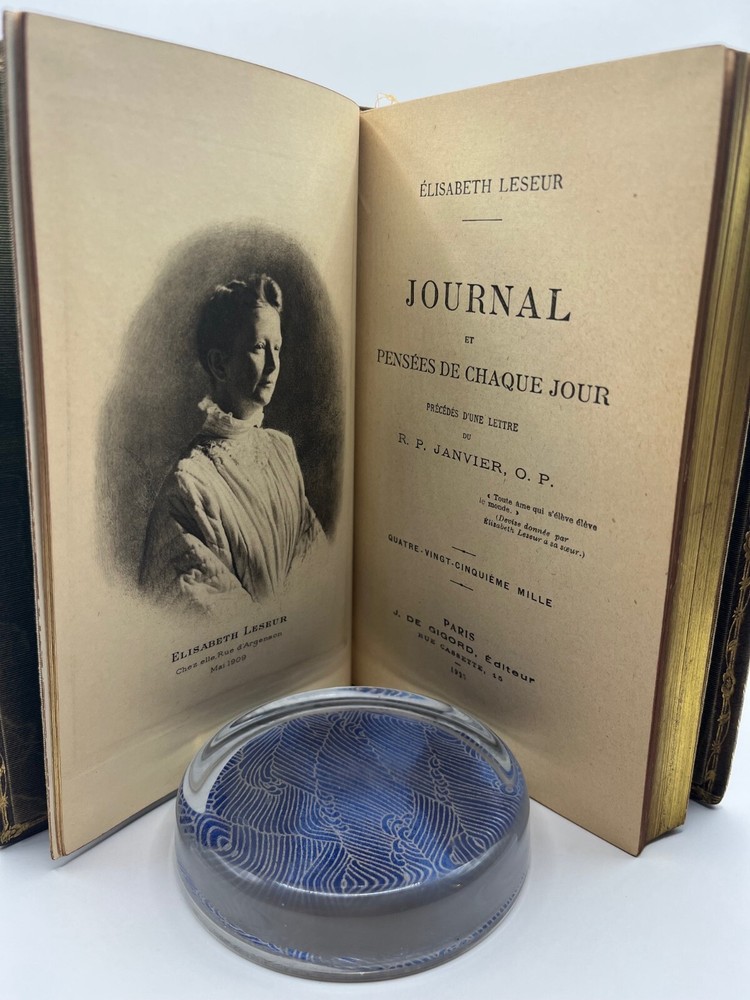 JOURNAL ET PENSEES DE CHAQUE JOUR ~ precedés d'une lettre du R.P. JANVIER O.P ELISABETH LESEUR publisher: J. De Gigord, Paris, 1925. Lovely leather rebinding with ornate decorative gilt tooling , lettering, gilt edges; satin cloth endpages; frontice portrait of the author; 338 pages, text in french, a pleasing production from a French mystic best known for her spiritual diary. Élisabeth Arrighi Leseur (16 October 1866 – 3 May 1914), born Pauline Élisabeth Arrighi, was a French mystic best known for her spiritual diary and the conversion of her husband, Félix Leseur (1861–1950), a medical doctor and well known leader of the French anti-clerical, atheistic movement.[1] The cause for the beatification of Élisabeth Leseur was opened in 1934. Her current status in the process is that of a Servant of God.