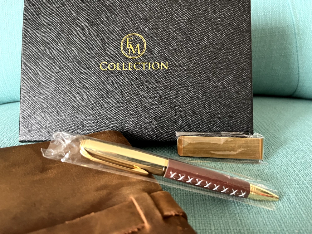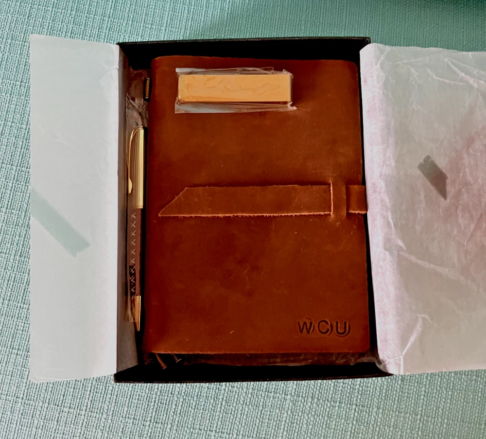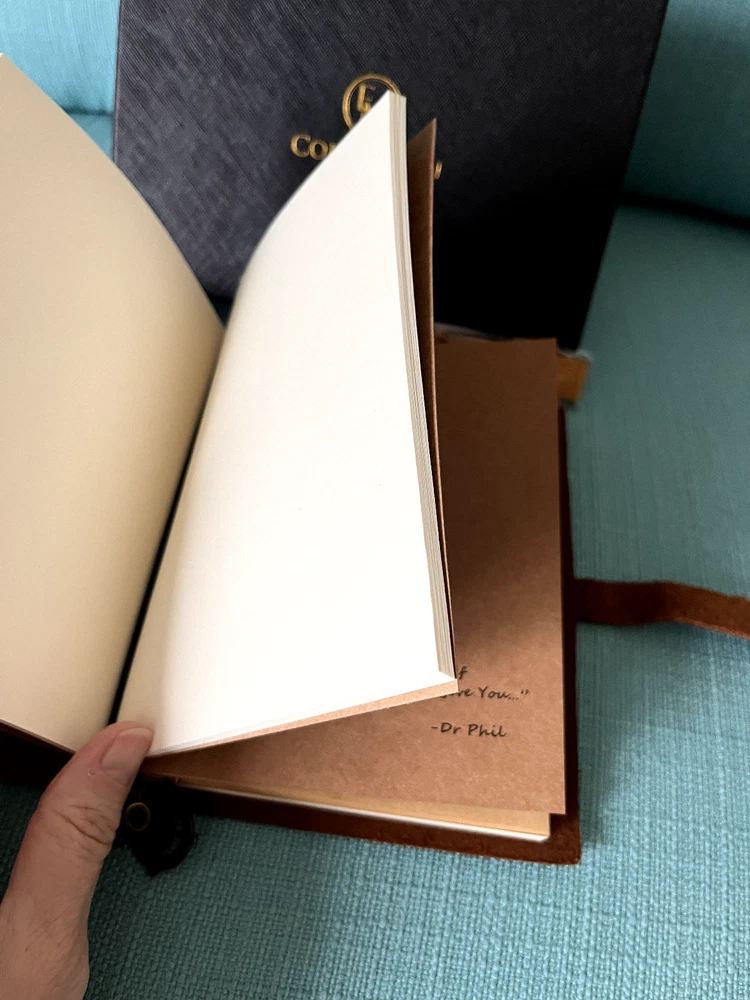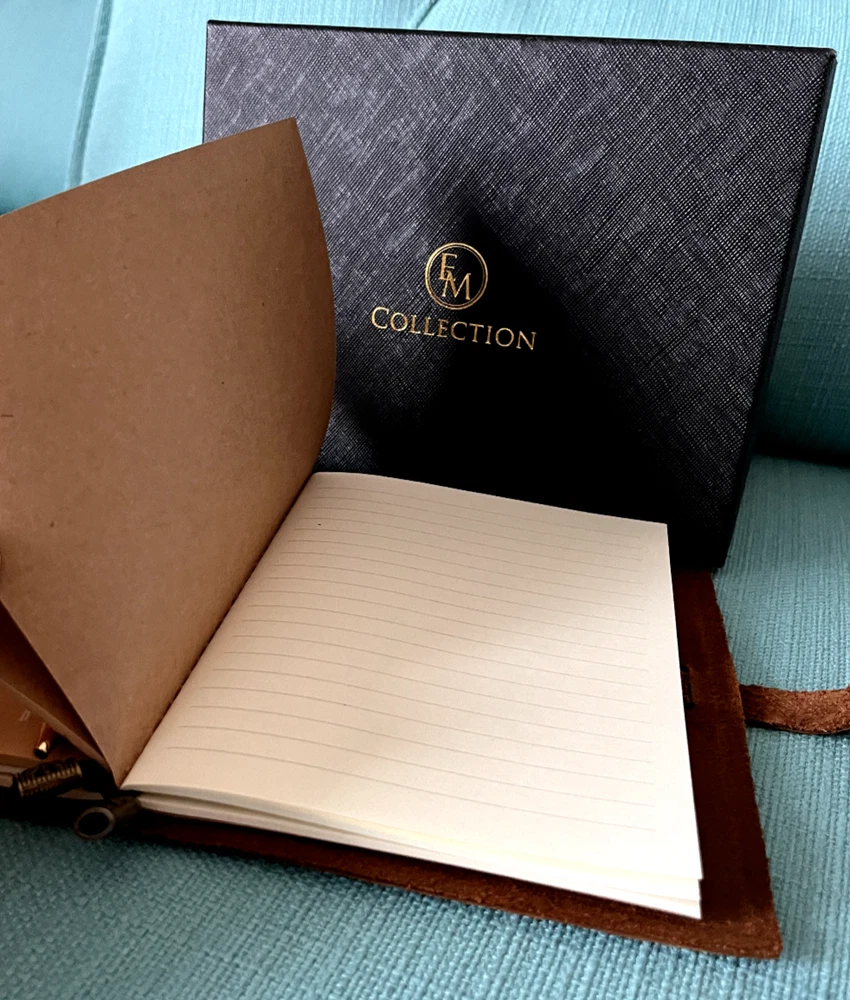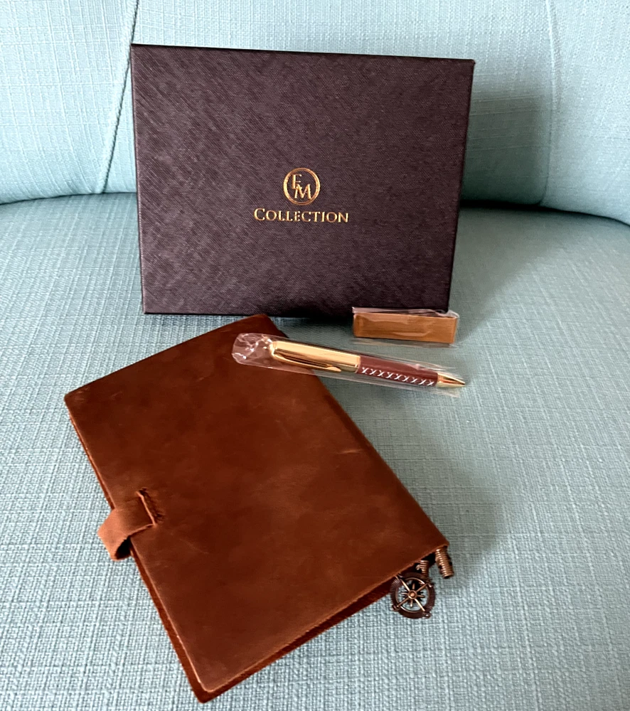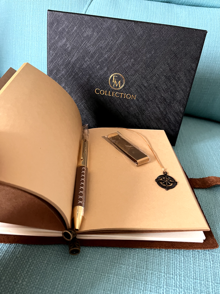 Please note this item has already been embossed in the lower right-hand corner with the initials WCU, and the price reflects this. Received as a gift at a business conference. The photos with white backgrounds are the manufacturers. The others are the actual item. The money clip does not have leather on it. Size 8.31 x 6.5 x 1.61 inches. Here's what the manufacturer says about this beautiful handcrafted journal: • Authentic leather with a fine scent and rustic charm • A versatile travel journal with 3 refillable notebooks - blank white, blank brown, and lined white. High-quality, eco-friendly paper ensures no bleed-through when using any pen or pencil. Perfect for travel and note-taking. • Robust construction that keeps the pages and every other thing in place • Overall durable feel – this is a journal that can last the motions of time • Classic gift box for anniversaries, birthdays, and holidays (thoughtful gift for both men and women) • Compass divider, metal clips, luxurious pen, and other accessories to complete your journaling kit • Versatile journal that can be used for weight watching, journalism work, food planning, Instagram photobook, poetry work, artist sketching, and travel diary This particular journal incorporates an authentic cowhide leather that can withstand the test of time, a classic box for gift-packaging, and accessories that are designed to make your journaling not only easier but also more enjoyable! • We created EM Collection from the hope to ignite the creativity in people throughout the world. Our customers are sophisticated travelers who know the world and appreciate the luxurious style of living. Non-pet, non-smoking home.