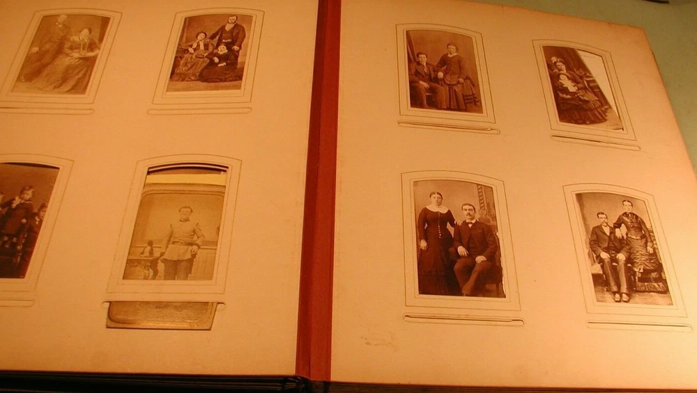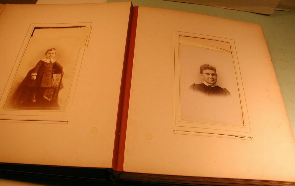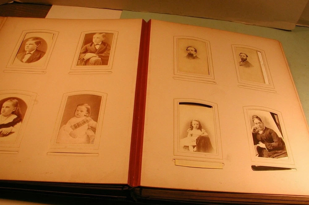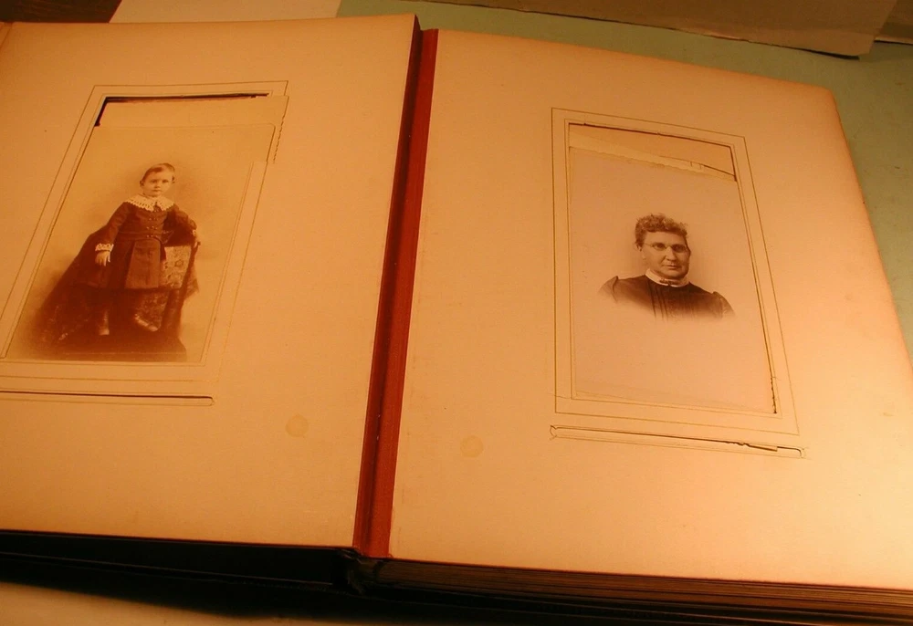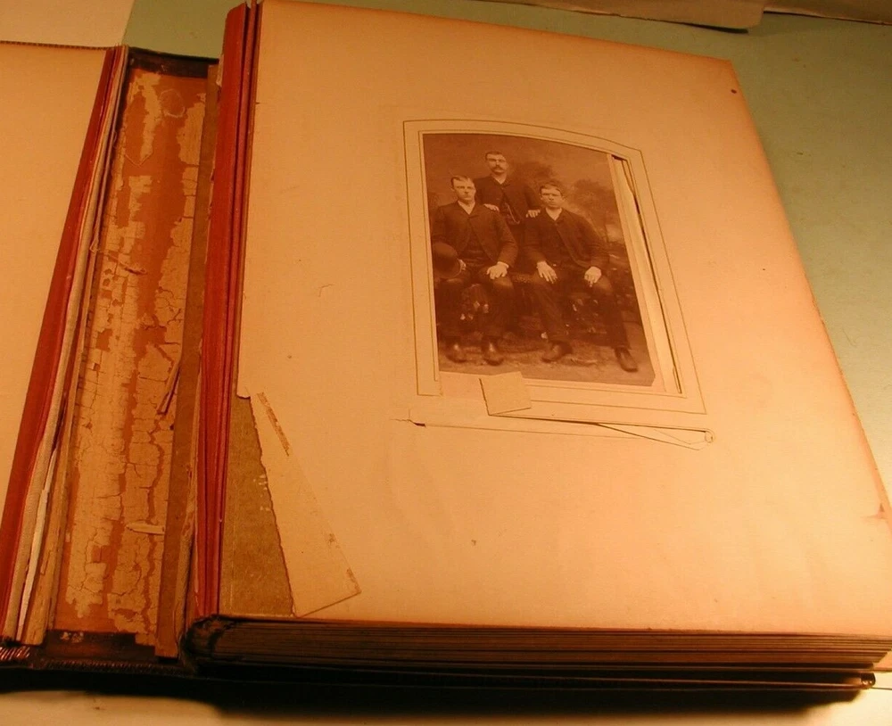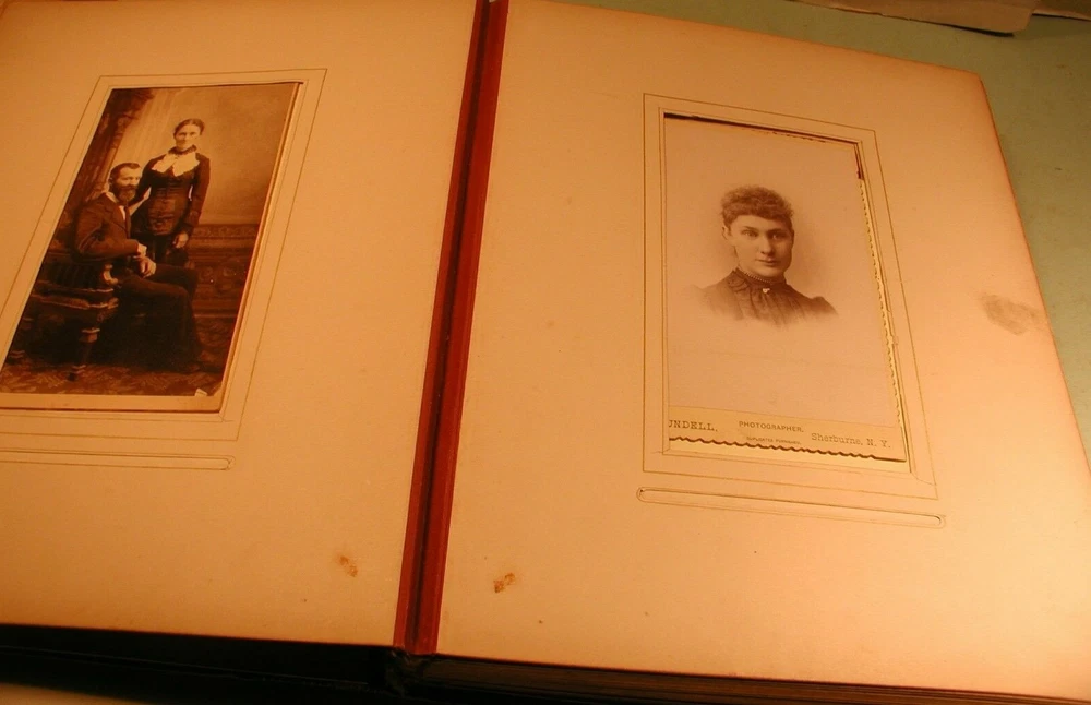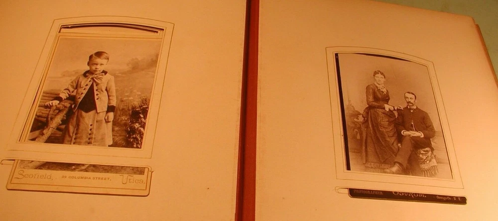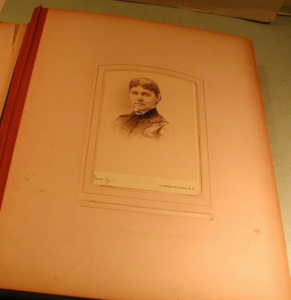 Early 1900's CDV's, cabinet photos and tintypes in leather bound photo album. Consists of 24 sheets for a total of 48 pages. The photos are of men and women photographed by Utica, NY photographers and others. The inside of spine is separated from cover, but all are intact. Covers are in good condition. Measures 11" wide by 13 1/2" long. Click on photo to enlarge. Shipping is 10 pound via ground mail. Do not pay until invoiced. Shipping discount for multiple purchases on same date. Insurance required on all items selling for more than $50.00. Buyer satisfaction is guaranteed. and is based on representation of item. Sales tax applies for buyers In New York State. Payment is due in 5 days.