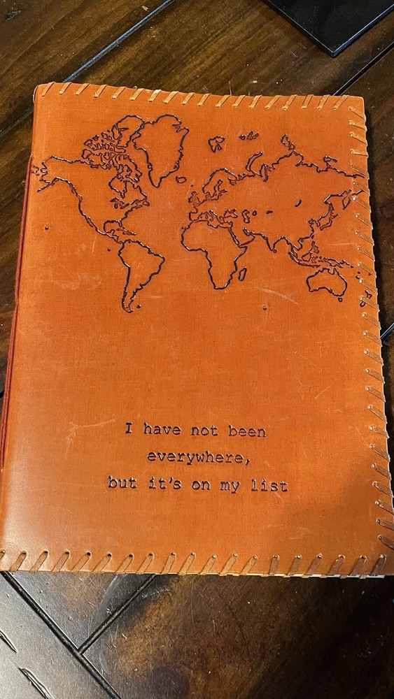 Earthbound Trading Company Leather Bound Blank Journal ~ Travel Theme and Motto Item Description: This is a handcrafted leather journal with a stitched binding and a world map engraving on the front cover. Below the map, it features the travel-related quote: “I have not been everywhere, but it’s on my list.” The journal has blank cream-colored pages, making it suitable for writing, sketching, or journaling. It appears to be of medium-to-large size, likely A5 or slightly larger. The leather cover has a rustic, vintage aesthetic, and the hand-stitched edges add to its artisanal charm.