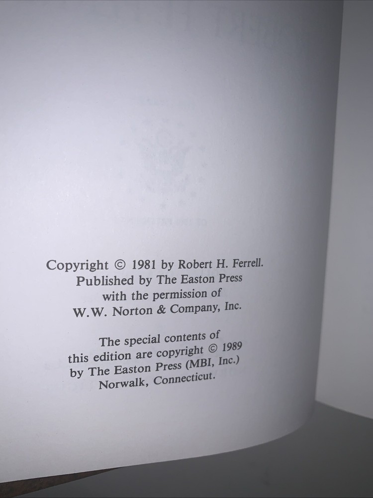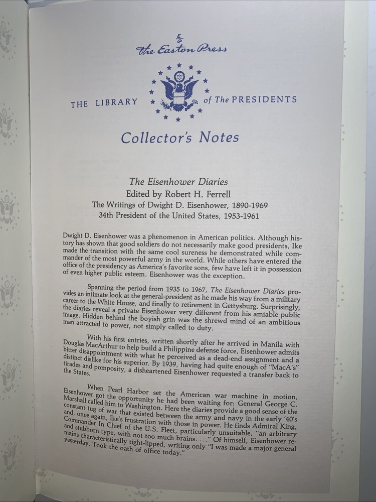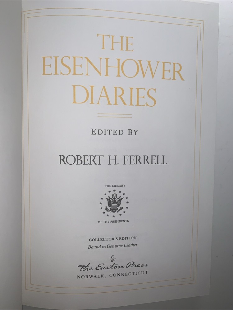 Easton Press Collectors Edition Leather Boards Eisenhower Diaries R Ferrell. Very clean with no problems noticed. Please inspect the pics as they are part of the description. Being preowned some of the Easton Press books may or may not have the bookplate or the Collectors notes included. If they are pictured they are included if not they aren’t. 197T