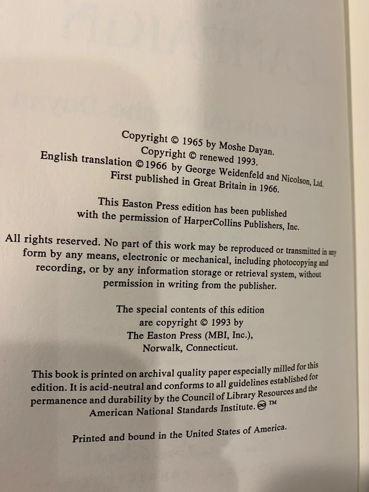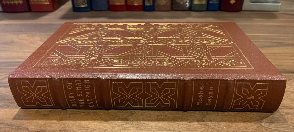 Moshe Dayan - Diary of the Sanai Campaign Military History Collector's Edition Hardcover Norwalk, Connecticut Easton Press, Leather Bound Limited Edition. Book accented in 22kt gold. Printed on archival paper with gilded edges. The endsheets are of moire fabric with a silk ribbon page marker. Smyth sewing and concealed muslin joints to ensure the highest quality binding. This book is in full leather with hubbed spines. Comes with Collector's Notes and Bookplate.