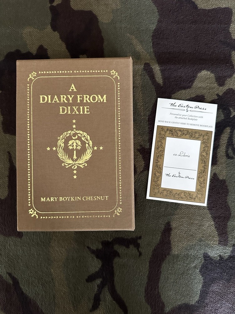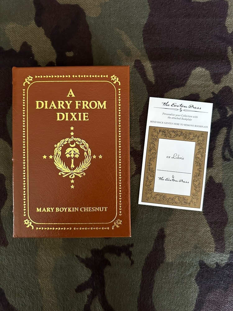 Easton Press collector's edition of a volume first published in 1905. Mary Boykin Chestnut's "A Diary from Dixie". She was the wife of James Chestnut Jr, a senator from South Carolina and a Brigadier General/Aide to Jefferson Davis during the Civil War. Covers events from 1860 to 1865. The book comes in a very nice decorative slipcase Measure approximately 6" x 8.25" x 1.5" thick. Printed in the USA on archival quality paper and fully bound in genuine leather. Sewn pages with moire end-pages and a satin ribbon page marker. Gilded page ends. Condition is like new. Comes with unattached, unused bookplate.
