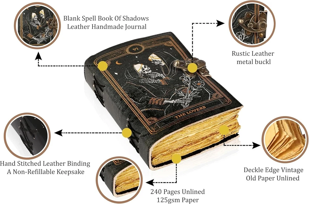 This grimoire is absolutely stunning—the genuine leather feels luxurious, and the antique vintage design gives it such a mystical vibe. The lock adds a cool, secretive touch, perfect for keeping spells or personal writing safe. The size is just right, easy to carry but still spacious enough for notes. The craftsmanship is amazing, and you can tell it’s handmade with care. Whether you’re into magic, journaling, or just love unique notebooks, this one’s a gem!