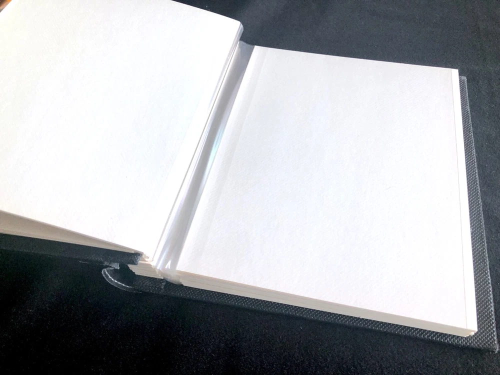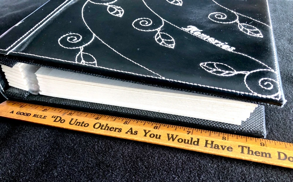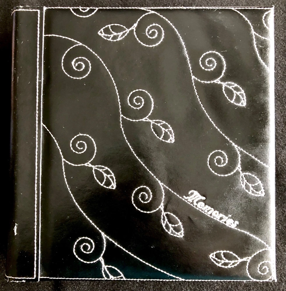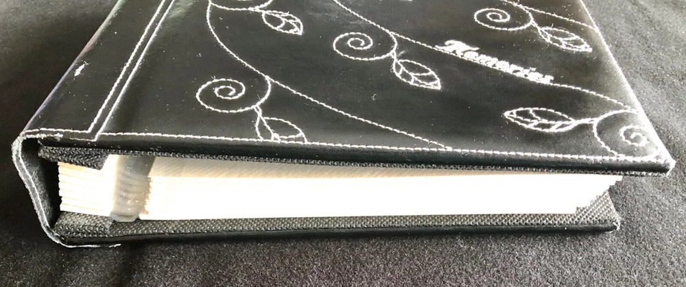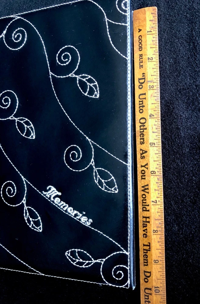Vintage Elsa L, Inc. Photo Album Black Bonded Leather White Sewn Scrolled Leaf Design for a classic, decorative front cover. Size: 9" x 9 1/2" 80 pg (fronts & backs). Well made. Holds 160 photos. Pages are quality plastic. Just carefully pull the plastic up from the page and insert & position the photo. Then, press plastic back down, around the photo. NOTE: This type of album is easy to add names of those in the photos, locations, funny captions, etc., because you can place the photos in any position, leaving room for small sections of text to be added. Great for mixed sizes of photos! Feature: Post binding-- meaning you can add or remove the pages. Many albums are fixed. Please note photo of the "end" section. The book is in 5 page sections. Eight sections. Very nice construction! Bought to use. Never did. (Wanna see my unfinished scrapbooks? :-{ ) #toobusyorjustlazyIguess PayPal Ships with tracking within 24-48 hours, week days. Week-ends when we can. Stored in non-smoking home with no pets.