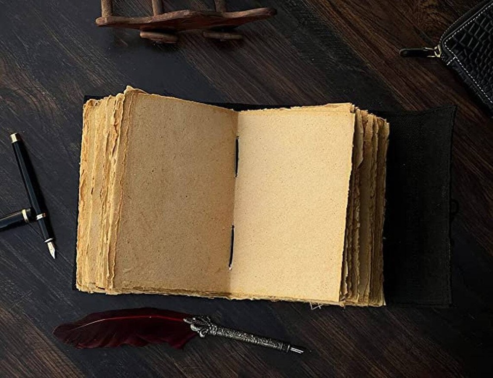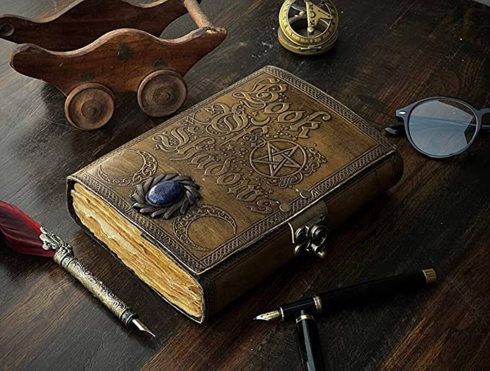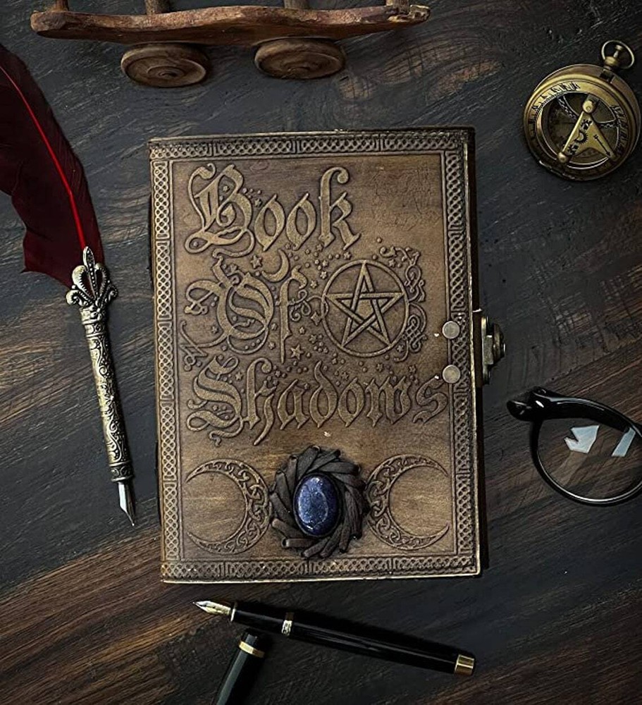 BOOK OF SHADOWS LEATHER PRINTED DESIGN - Perfectly print with the Book of Shadows designs, this journal makes a thoughtful gift to anyone of different cultures. UNIQUE HANDMADE VINTAGE PAPER - Vintage Journal is made with 200 pages of Antique Paper which looks like it was pulled from history. You will fall in love with the the antique handmade cotton paper which is unique to our Vintage Journal Notebook EXQUISITE & UNIQUE SEMI PRECIOUS STONE: The vintage journal is antique color embossed with a special stone called “lapis lazuli” which helps to reveal inner truth within yourself and encourage self-awareness and self expression. We have taken extra to make sure that the emboss is perfect in every piece. VINTAGE LOCK AND STURDY BINDING - The vintage lock will keep all your valuable writing locked inside.Sturdy hand stitched binding to make sure that no paper comes out loose from your vintage notebook. USE ANY KIND OF PEN - Sketch, Doodle, Write on your Leather Bound Journal with a Calligraphy Pen Fountain Pen, Brush Pen, Ball Pen, Acrylic Colors, Watercolor and many more. We guarantee no bleed through. MANY USES - Can be used as a notepad, journal, writing notebook, sketch book. 1.25 inch thickness, easy for handwriting, drawing or sketching and compact for carrying in your bag. Ideal for alternative Artist Sketchbooks, Photo Album, Traveling Notes, Business Executive, Logbook, Poetry Work, Journalists, Food Planner, Instagram Scrapbook and Bible Journaling.