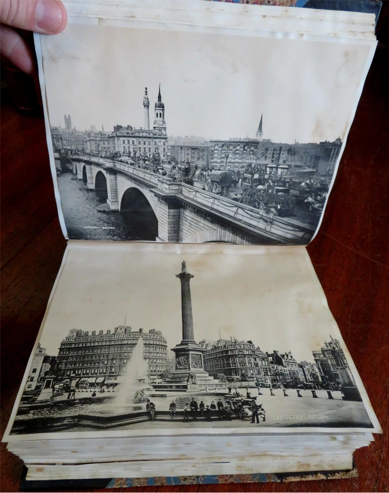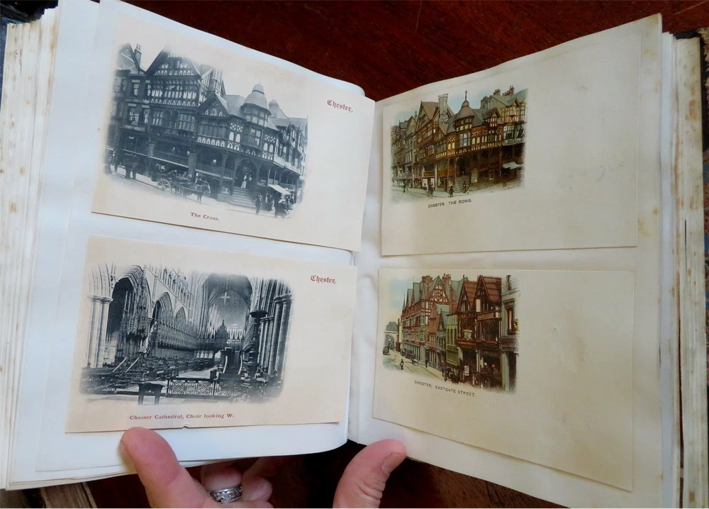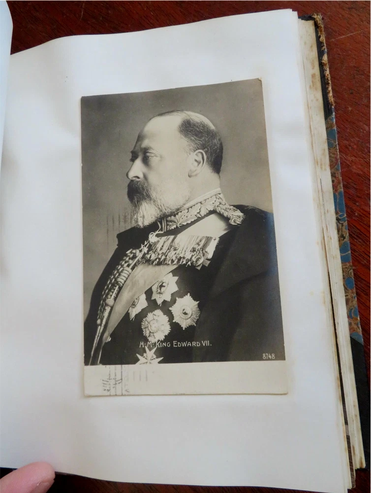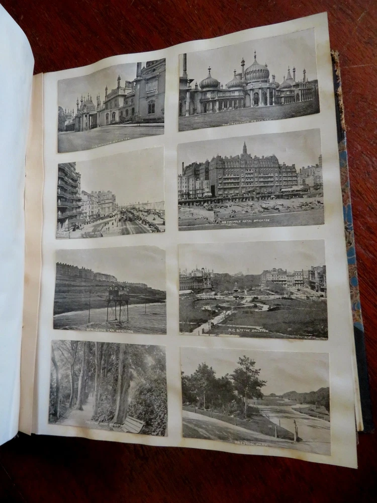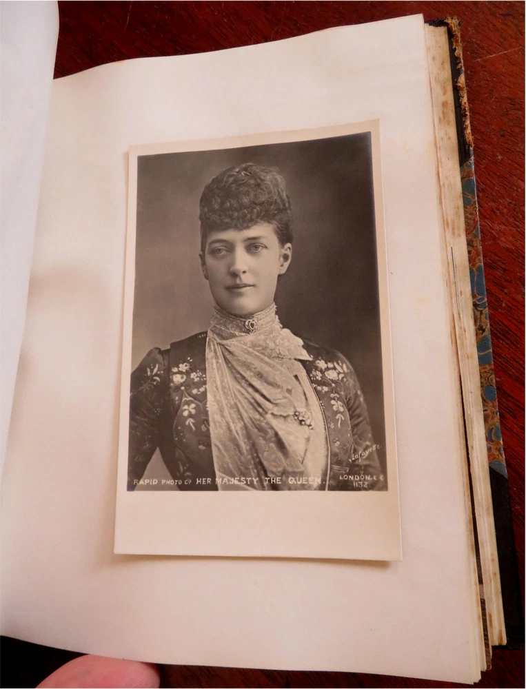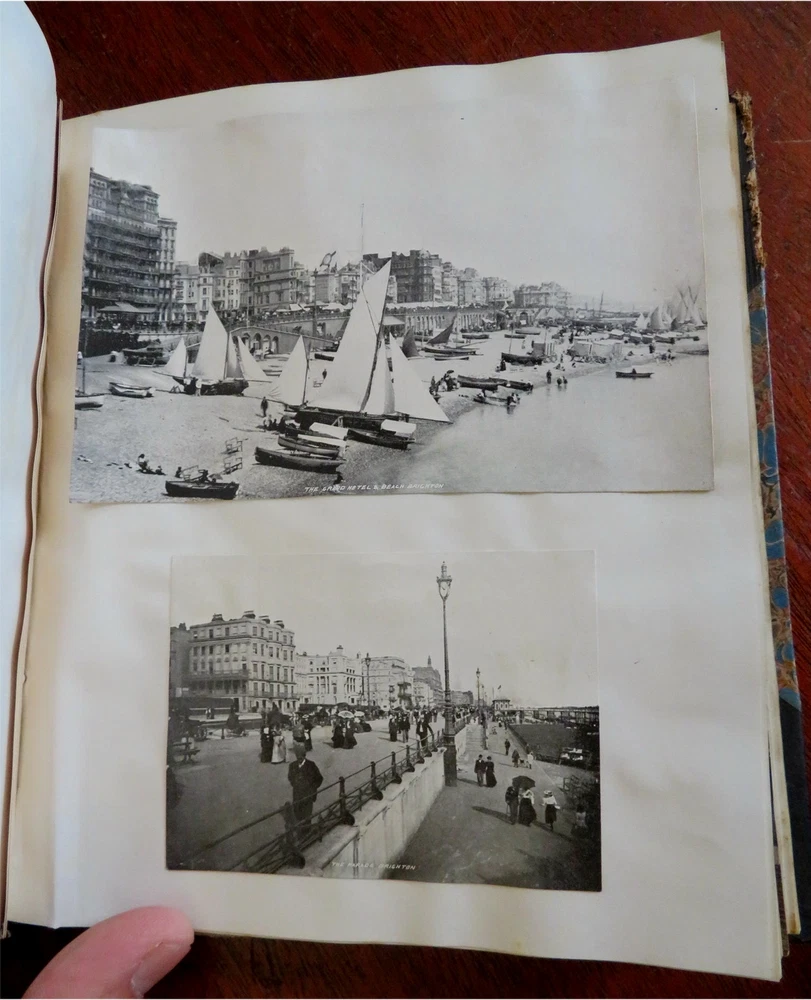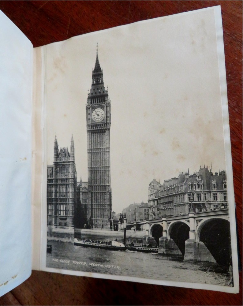 England Scrap Book Post Cards Portraits Views 1904 tourist travel leather album England Scrap Book Post Cards Portraits Views 1904 tourist travel leather album (Old Books, 20th Century Books, Leather Books, Souvenir Albums, Scrap Books, Travel, Tourism, England Post Cards, Portraits, Architectural Views). England. Published c. 1910, Boston by J. Fairbanks. c. 80 pages. Text in English. Profusely illustrated w/ c. 110 photographs, postcards (numerous are real photo) & various other engraved and offset printed images. Very nice contents. Attractive antiquarian 1/2 leather binding, smooth spine, gilt bands, hand lettered paper title label, marbled covers. Scrapbook is physically old and shows some signs of handling and time. Binding gently age worn but still appealing, leather and joints slightly rubbed but still supple, remains overall very attractive as an object. Text block paper is gently age toned as typical, internally book remains mostly clean, tight and sound. A book which has been taken care of but may/ does not look like new. Still attractive on the shelf. Book displays a pleasing and unique age patina and is in rather nice antiquarian condition, any age flaws seem easy to overlook or forgive. Please review photos for more detailed attempt to present this book as it survives. We often over-describe any flaws that many sellers would not even bother to mention since most people would overlook them as minor and unworthy of comment. Many people tell us the books they receive from us are nicer in person than they appears on the screen. We want you to be clear about what you are buying, so we take numerous photos and try to describe it openly and honestly. Book Measures c. 8 1/2" H x 7" W. [B9216].