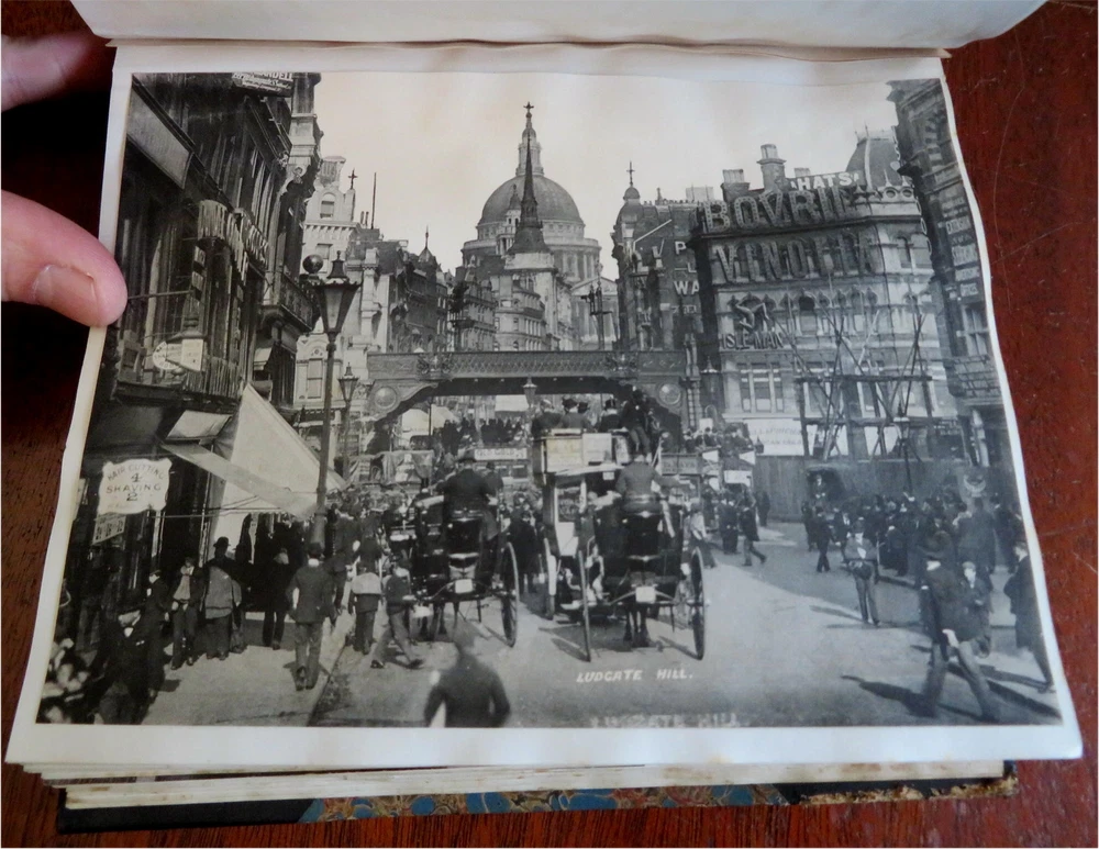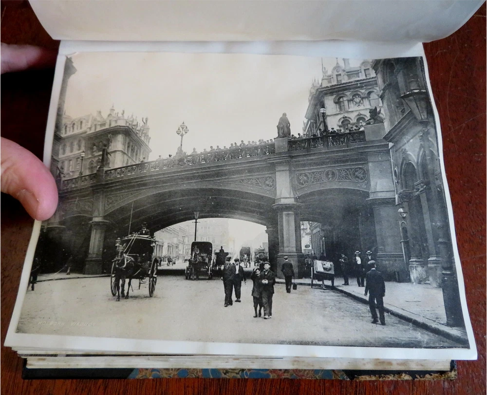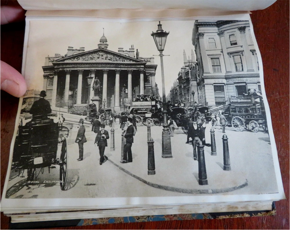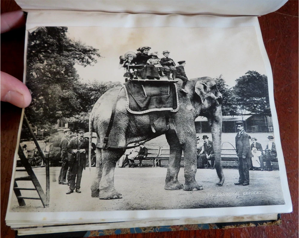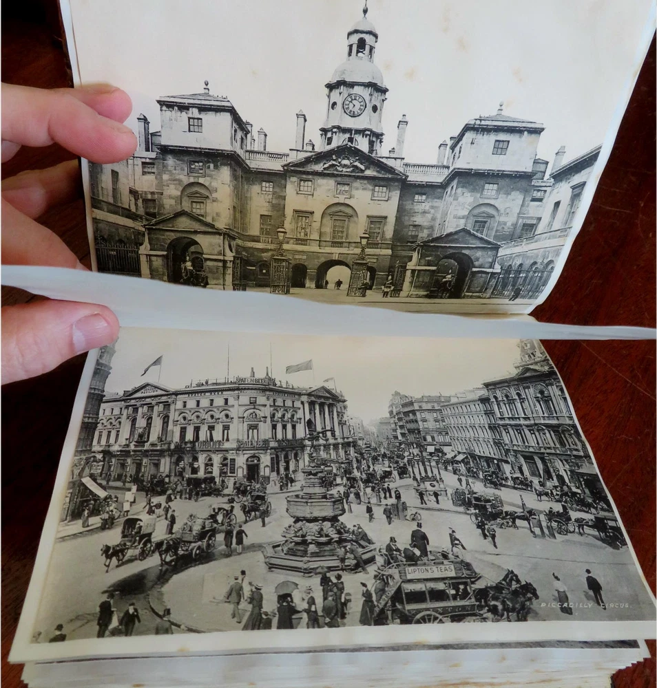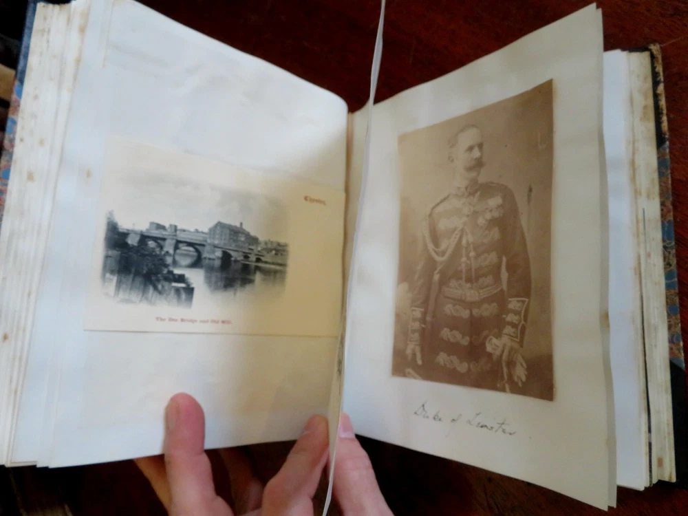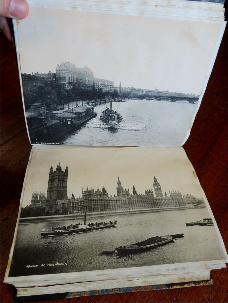 England Scrap Book Post Cards Portraits Views 1904 tourist travel leather album England Scrap Book Post Cards Portraits Views 1904 tourist travel leather album (Old Books, 20th Century Books, Leather Books, Souvenir Albums, Scrap Books, Travel, Tourism, England Post Cards, Portraits, Architectural Views). England. Published c. 1910, Boston by J. Fairbanks. c. 80 pages. Text in English. Profusely illustrated w/ c. 110 photographs, postcards (numerous are real photo) & various other engraved and offset printed images. Very nice contents. Attractive antiquarian 1/2 leather binding, smooth spine, gilt bands, hand lettered paper title label, marbled covers. Scrapbook is physically old and shows some signs of handling and time. Binding gently age worn but still appealing, leather and joints slightly rubbed but still supple, remains overall very attractive as an object. Text block paper is gently age toned as typical, internally book remains mostly clean, tight and sound. A book which has been taken care of but may/ does not look like new. Still attractive on the shelf. Book displays a pleasing and unique age patina and is in rather nice antiquarian condition, any age flaws seem easy to overlook or forgive. Please review photos for more detailed attempt to present this book as it survives. We often over-describe any flaws that many sellers would not even bother to mention since most people would overlook them as minor and unworthy of comment. Many people tell us the books they receive from us are nicer in person than they appears on the screen. We want you to be clear about what you are buying, so we take numerous photos and try to describe it openly and honestly. Book Measures c. 8 1/2" H x 7" W. [B9216].