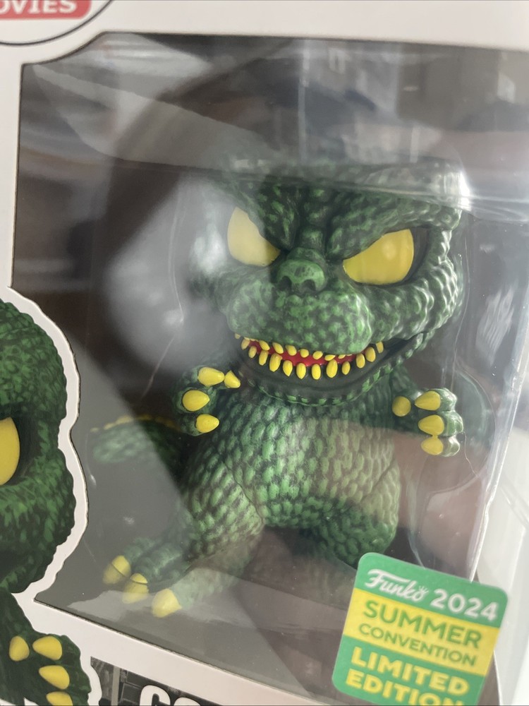 The product is a Funko Pop vinyl figure of Godzilla from the movie franchise. This specific figure was released at San Diego Comic Con in 2024 and comes with a free additional Pop figure. The figure is green in color and comes in its original unopened packaging. It is part of the Pop! product line and features exclusive event/retailer details, making it a sought-after collectible for fans of Godzilla and Funko Pop figures.