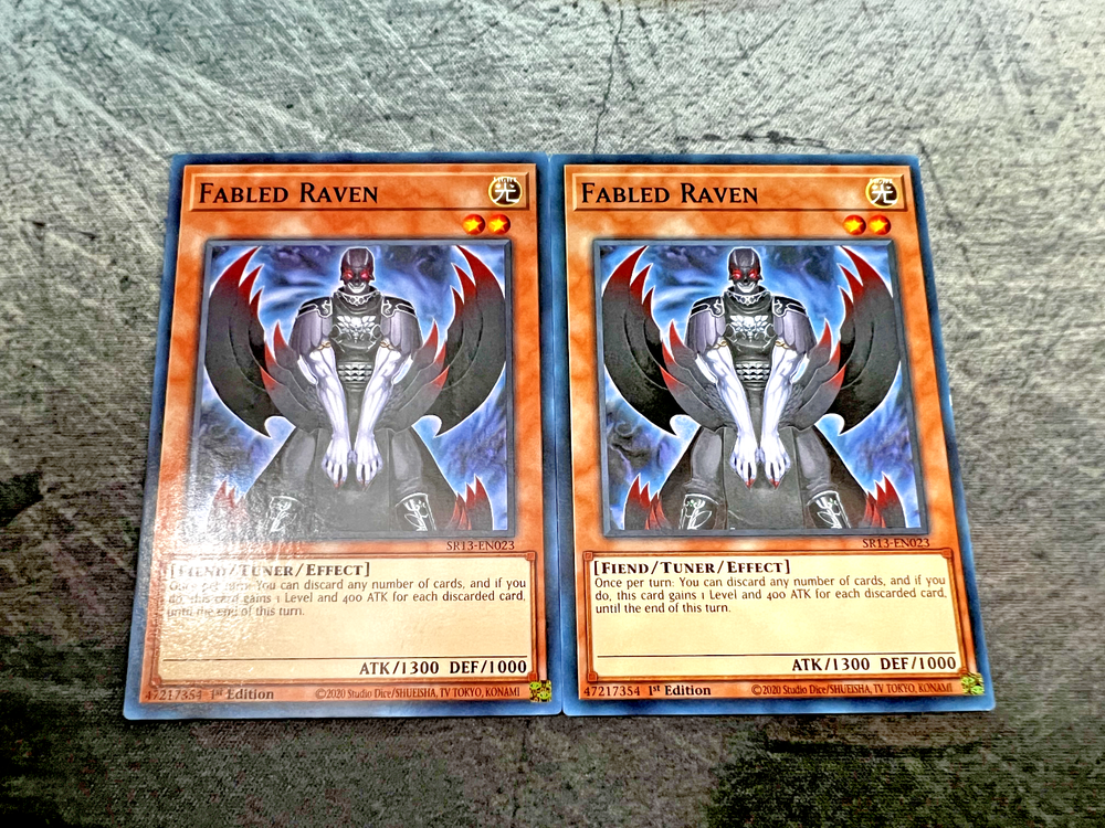 Elevate your Yu-Gi-Oh! TCG strategy with the Fabled Raven, card number SR13-EN023 from the Structure Deck: Dark World. As a 1st Edition Effect Tuner card, it allows you to exert unprecedented control over the game state, bolstering your deck with its unique abilities. With an attack power of 1300 and defense toughness of 1000, this Fiend-type card is a formidable addition to both your offensive and defensive lineup.Konami's craftsmanship shines with this English-language card, ensuring players can easily understand its capabilities. Rarity classification as a Common / Short Print signifies its level of scarcity, making it a valuable asset for collectors and competitive players alike. Whether you're looking to enhance your gaming experience or complete your collection, the Fabled Raven is a must-have for any Yu-Gi-Oh! enthusiast. This listing is for TWO (2x) cards!