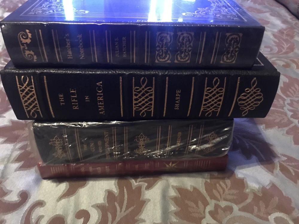 4 books containing Hatchers Notebook Julian S Hatcher (sealed) Guns of Old West Chapel (Sealed) The Gun and its development WW Greener (Partially Sealed) The Rifle in America Sharpe (not sealed but li...