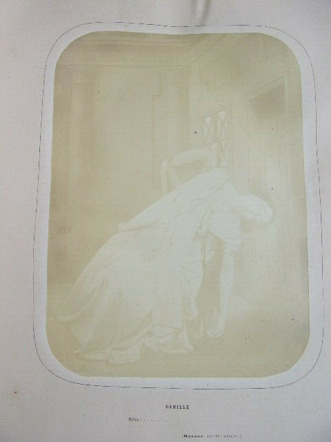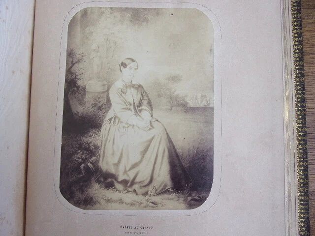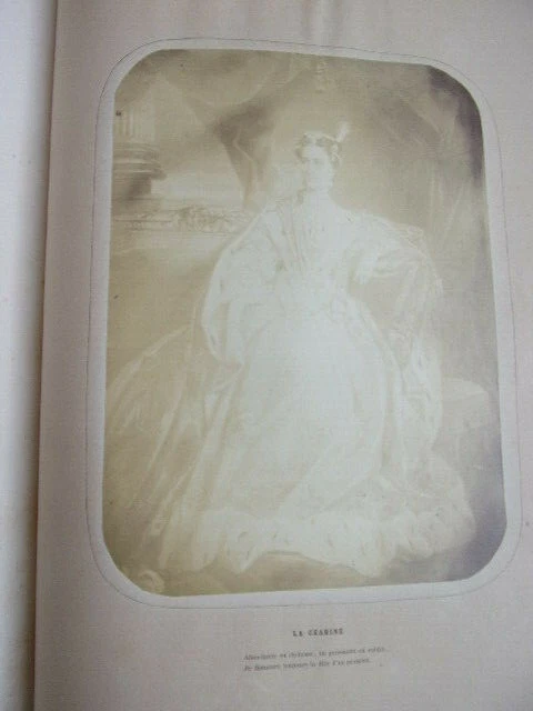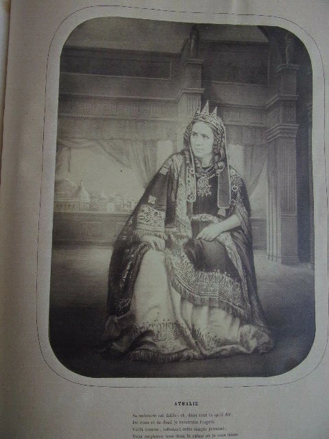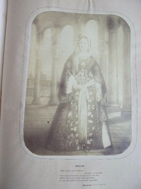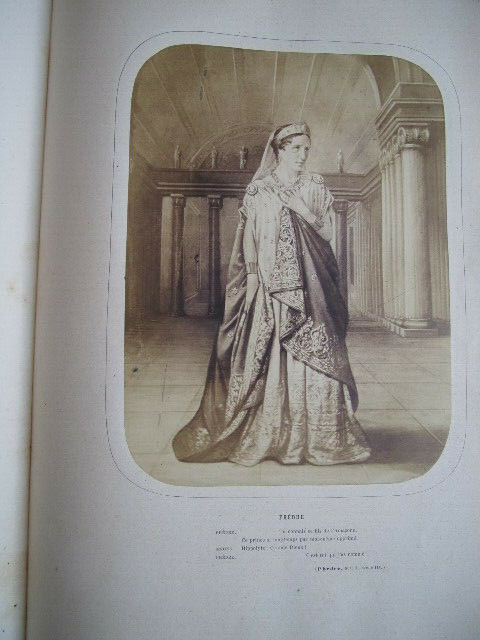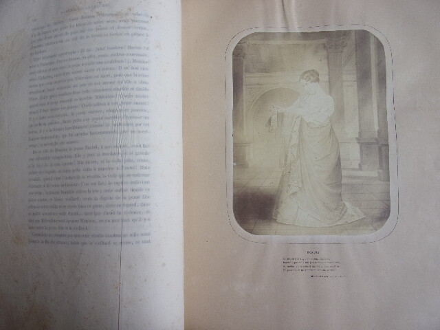 Rachel et la tragédie. Jules Janin ouvrage orné de 10 photographies albuminées représentant Rachel dans ses principaux rôles; Camille, Monime, Phèdre, Roxane, Athalie, La Rachel au Cannet, Czarinne. Un des premiers livres illustré par la photographie. vol in folio, 370x280, reliure signée Petit, successeur de Simier, plein maroquin, frottements sur les mors et sur la coiffe, toutes tranches dorées, très bon état intérieur, légère pliure sur les pages de photographie dues à la rétraction du papier suite au collage, 528pp. Paris, Amyot, Libraire 1859. Édition Originale. Élisabeth-Rachel Félix, dite Rachel ou Mlle Rachel, est une actrice née le 21 février 1821 à Mumpf (Suisse) et morte le 3 janvier 1858 au Cannet (France). Grande tragédienne, elle fut un modèle pour Sarah Bernhardt. translate : Rachel and the tragedy. Jules Janin 10 albuminated photographs depicting Rachel in her main roles; Camille, Monime, Phèdre, Roxane, Athalie, La Rachel au Cannet, Czarinne. One of the first books illustrated by photography. vol in folio, 370x280, binding signed Petit, successor of Simier, full maroquin, rubbing on the jaws and on the cap, all gilded slices, very good interior condition, light folding on photographic pages due to shrinking of paper after pasting, 528pp. Paris, Amyot, Libraire 1859. Original Edition. Élisabeth-Rachel Félix, known as Rachel or Miss Rachel, is an actress born on February 21, 1821 in Mumpf (Switzerland) and died on January 3, 1858 in Le Cannet (France). A great tragedy, she was a role model for Sarah Bernhardt.