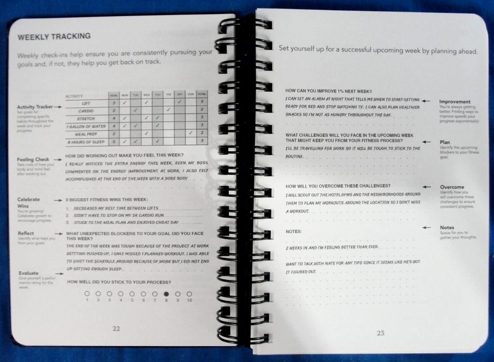 Unique Professional - Fitness Workout Journal by FitJourn 234 Pages 8 3/8" x 6 3/4" Spiral Bound Workout Log Book with strong emphasis on Goal Setting Elastic / Closure Band WEEKLY Detailed Tracking pages ---------------------------- get health now with instant shipping