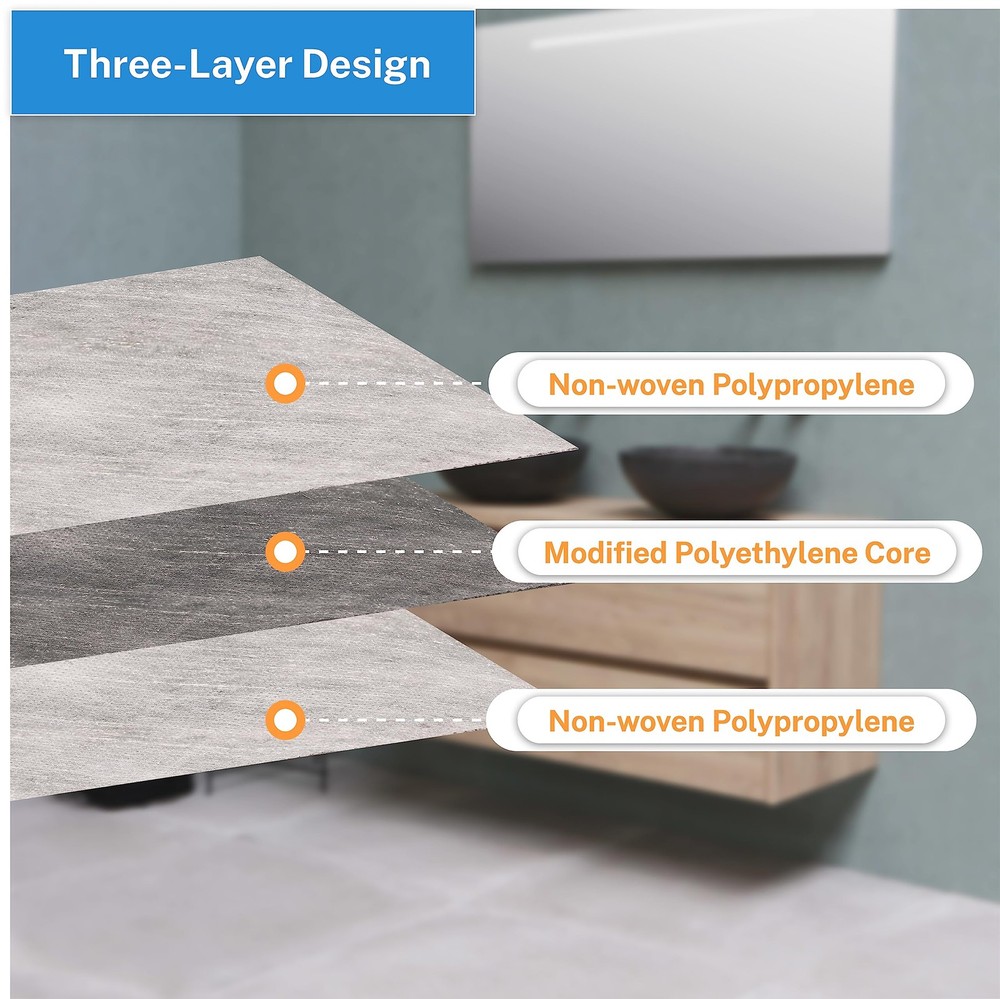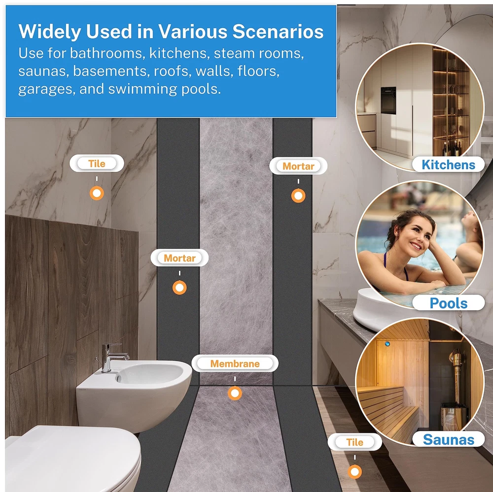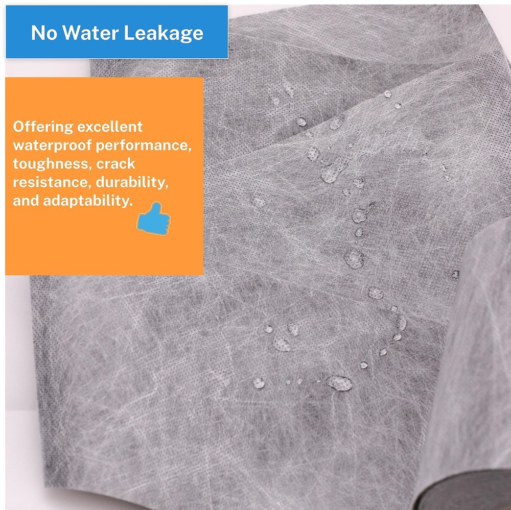 Product Specifications: Size: 5in x 33ft (12.7cm x 10m) Thickness: 25.6mils (0.65mm) Coverage Area: 13.75 sq.ft (1.27㎡) Experience unbeatable waterproof performance, durability, and adaptability with our premium Polymer Waterproof Membrane. Designed to exceed industry standards, our product stands out with its exceptional thickness, providing enhanced protection and peace of mind. Crafted with high-quality materials, our waterproof membrane combines polyethylene and polypropylene, creating a robust composite that ensures maximum strength and longevity. We utilize cutting-edge technology in our automated production line, incorporating anti-aging agents, stabilizers, and adhesion promoters to deliver superior performance. Durability is the core of our design. Our flooring underlayment features a three-layer structure, with polypropylene on the front and back, and a polyethylene core. This construction guarantees excellent tensile strength, impermeability, and low-temperature flexibility, making it the perfect choice for year-round construction projects. Versatility is key when it comes to waterproofing solutions, and our membrane delivers just that. Whether it's bathrooms, kitchens, steam rooms, saunas, basements, roofs, walls, floors, or garages, our membrane provides comprehensive waterproofing solutions. Install it beneath bathroom floors, walls, corners, or shower floors to ensure long-term dryness and protection. Installing our waterproof membrane is a breeze. Thanks to its user-friendly design, you can easily cut it with scissors or a knife to fit your specific needs, saving you time and effort during installation. Plus, we stand behind the quality of our product. If you encounter any quality-related issues, simply reach out to us, and we'll provide a satisfactory solution within 24 hours. Invest in high-quality, cost-effective waterproofing with the Polymer Waterproof Membrane. Upgrade your construction projects and enjoy the peace of mind that comes with exceptional waterproof performance, toughness, crack resistance, durability, and adaptability. 【Polymer Waterproof Membrane】 Size: 5in x 33ft (12.7cm x 10m); Thickness: 25.6mils (0.65mm); Coverage Area: 13.75 sq.ft (1.27㎡). Our product is thicker than most on the market, offering excellent waterproof performance, toughness, crack resistance, durability, and adaptability. We are committed to providing customers with high-quality, cost-effective solutions. 【High-quality materials】 This polyethylene polypropylene composite waterproof membrane is manufactured using an automated production line, combining raw polyethylene synthetic polymer materials with high-strength new polypropylene polyester filament non-woven fabrics. It incorporates anti-aging agents, stabilizers, and adhesion promoters for enhanced performance. 【Durable and Long-lasting】 Our flooring underlayment consists of three layers: polypropylene on the front and back, and polyethylene in the middle. Made from high-quality materials, our waterproofing membrane is built to last. It offers excellent tensile strength, impermeability, and low-temperature flexibility, making it suitable for year-round construction. 【Versatile Applications】 waterproof membrane is ideal for various applications, including bathrooms, kitchens, steam rooms, saunas, basements, roofs, walls, floors and garages. It provides comprehensive waterproofing solutions and can be installed beneath bathroom floors, walls, corners, and shower floors to ensure long-term dryness. 【Easy Installation】 With a user-friendly design, our waterproof membrane can be easily cut with scissors or a knife according to your specific needs, saving you time and effort. If you have any quality-related issues, please feel free to contact us, we will provide a satisfactory solution within 24 hours.