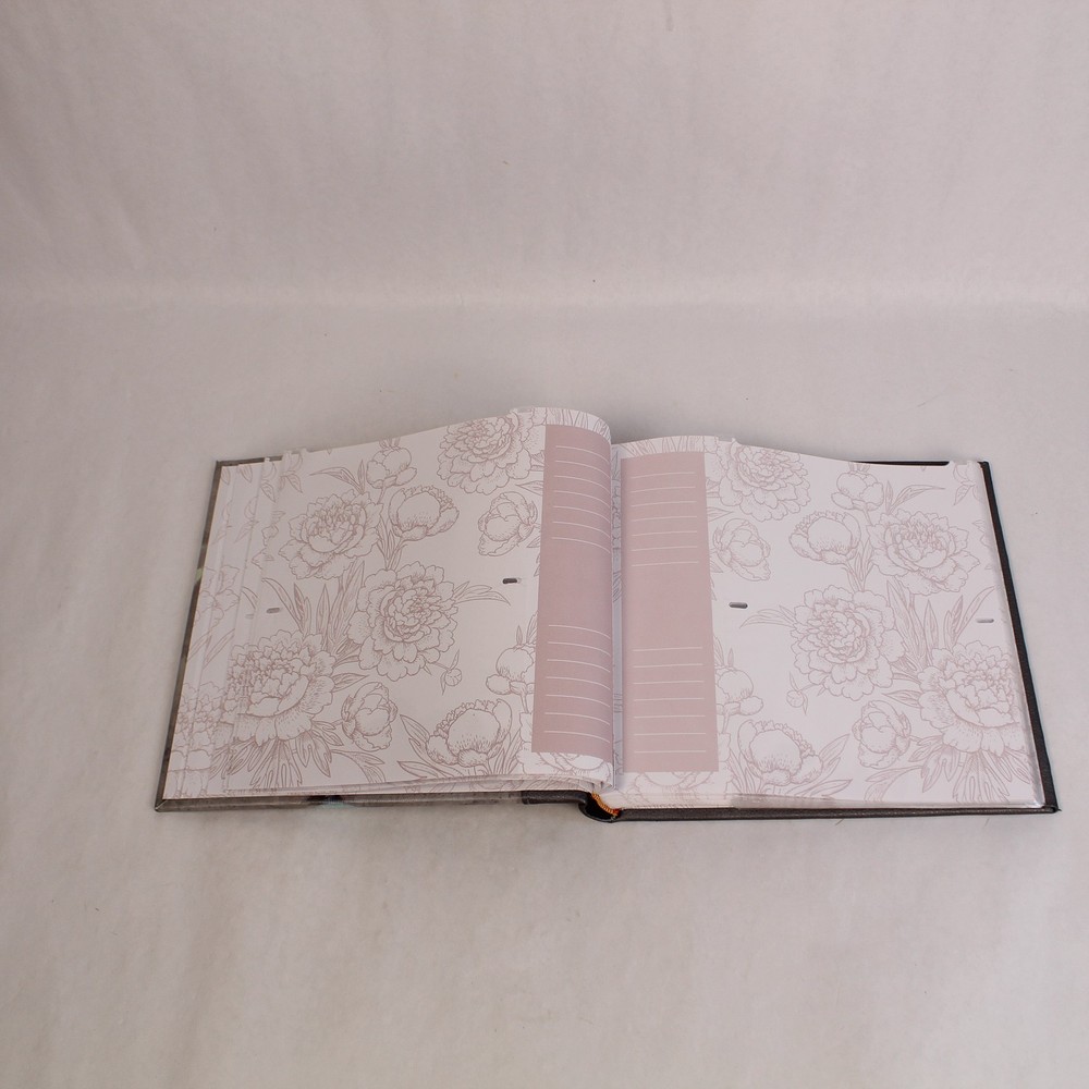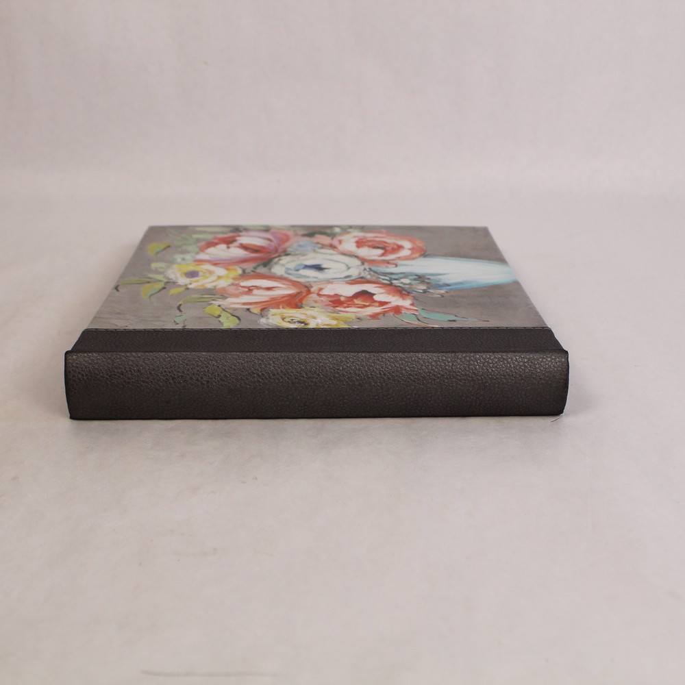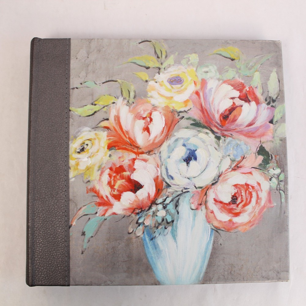 Beautiful floral painted photo album with a textured faux leather spine. Holds up to 120 photos sized 4" x 6". Measures approximately 9" tall, 8.75" wide, and 1.25" deep. Very good pre-owned condition, perfect for preserving your cherished memories.