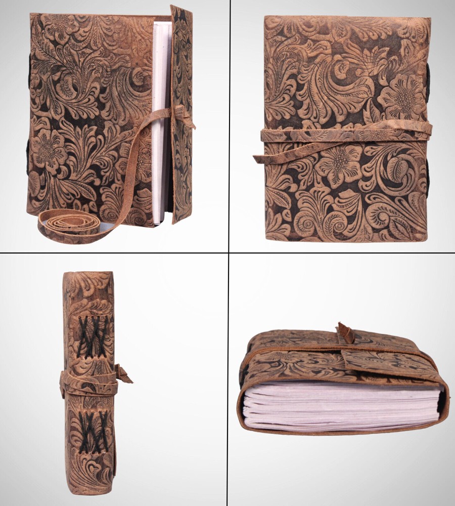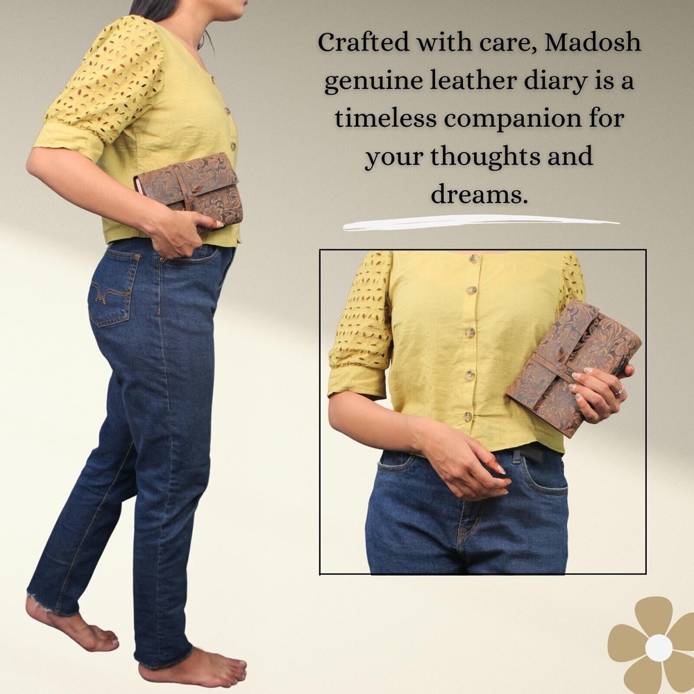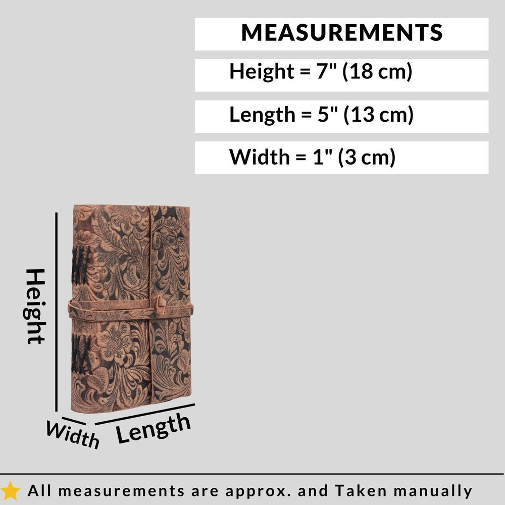 Welcome To Mad Over Shopping TM (Brand: Madosh-Mad Over Shopping) Introducing our exquisite Flower Embossed Leather Journal – a perfect blend of elegance and functionality, designed to elevate your writing experience. The floral embossing creates a captivating tribute to the grace of nature's bloom, setting the stage for your thoughts, sketches, and creative expressions Crafted with precision and attention to detail, this diary is more than just a place to jot down your thoughts, it's a work of art that reflects your style and sophistication. Elevate your journaling experience with a diary that captures the essence of nature's grace, inviting you to express your creativity in the whispers of blooming flowers. SIZE: Height: 7” (18 cm) | Length: 5” (13 cm) | Width: 1” (3 cm) PRODUCT DETAILS: Genuine leather Flower Embossed Vintage Paper 200Pages Thread Closure Country of origin: India Handmade NOTE: 100% Genuine leather diary. Color may slightly vary from pictures. 100% recycled cotton acid free paper used in diary.