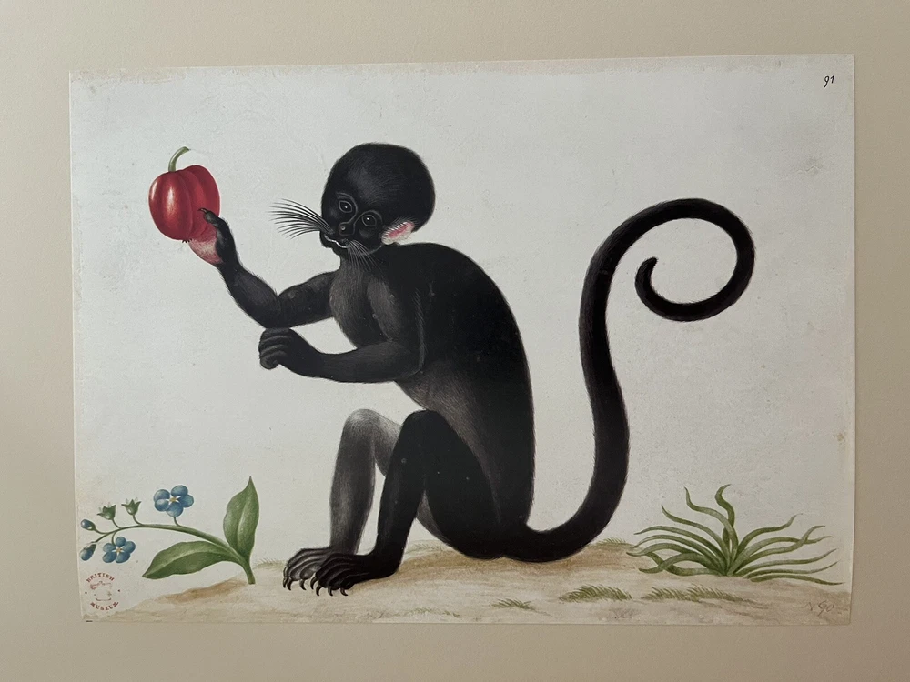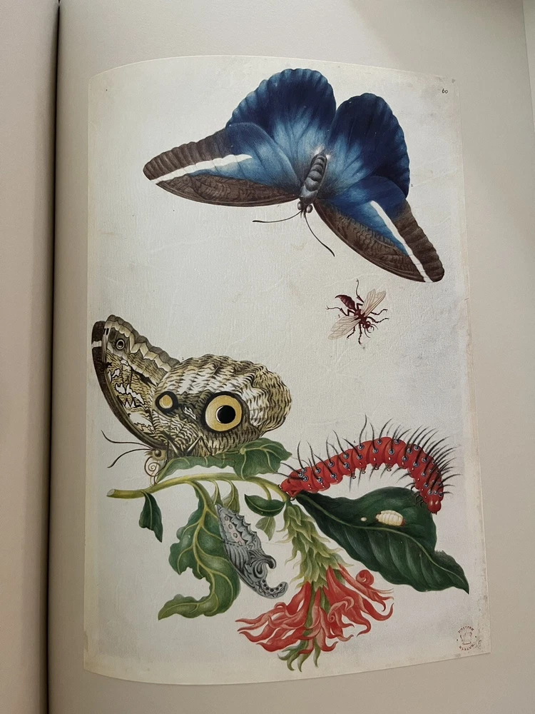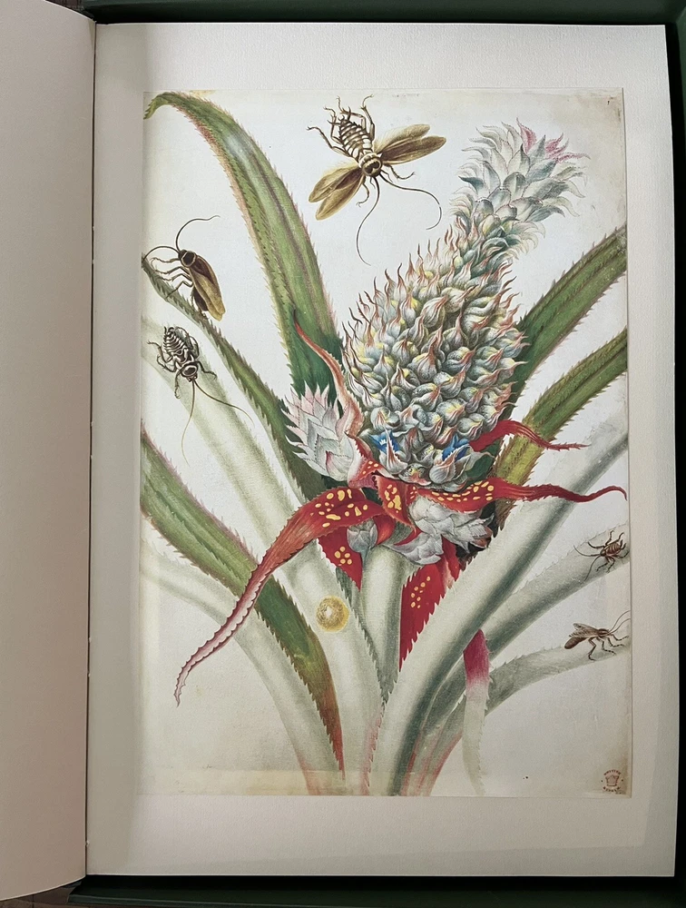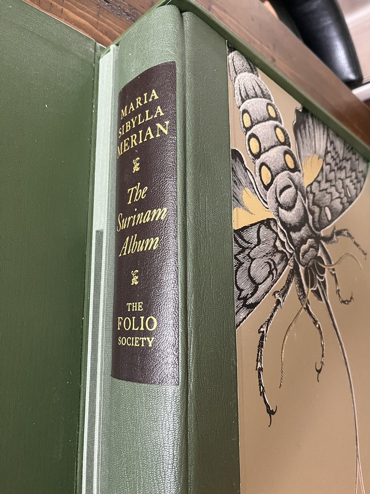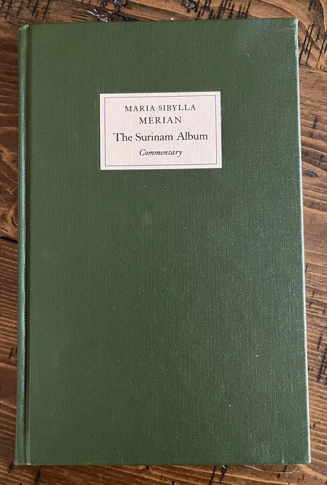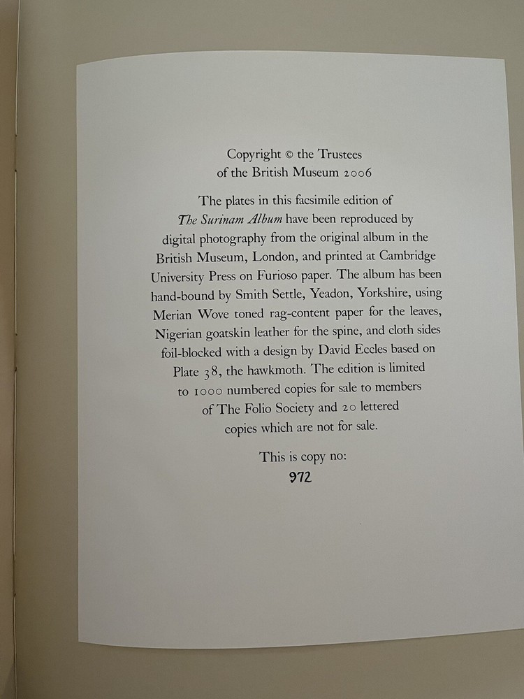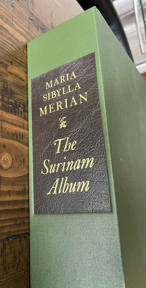 The Surinam Album by Maria Sibylla Merian UK: The Folio Society, 2006 Introduction by Julie Harvey of the Entomology Library at the Natural History Museum. Number 972 of 1000 copies, WITH three prints and commentary volume The plates in this facsimile edition of "The Surinam Album" have been reproduced by digital photography from the original album in the British Museum, London, and printed at Cambridge University Press on Furioso paper . Quarter bound in the finest Nigerian goatskin leather. Blocked in gold and silver with a design by David Eccles. Buckram-bound solander box/clamshell case. 91 facsimile prints tipped in by hand. 20¼" x 18".