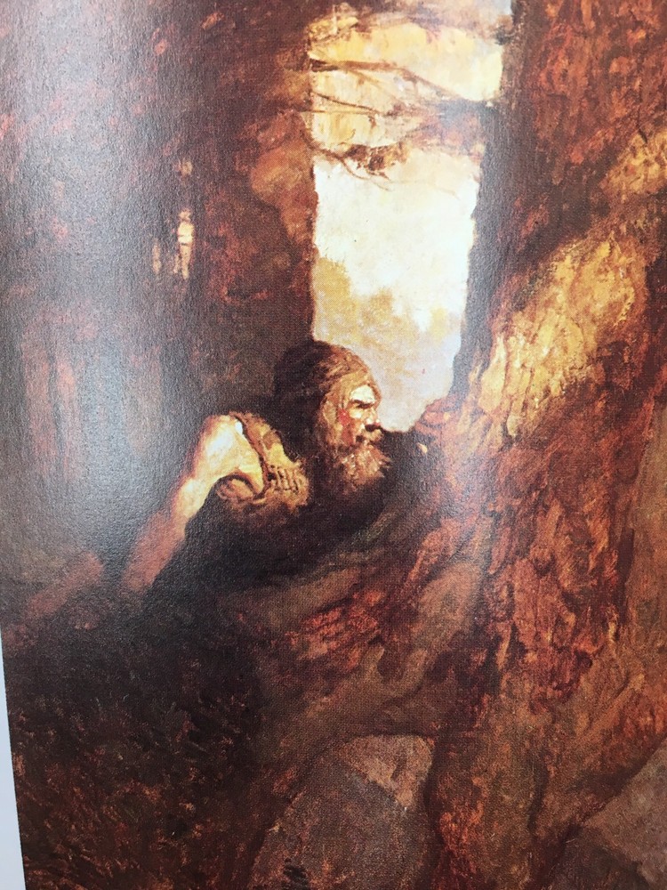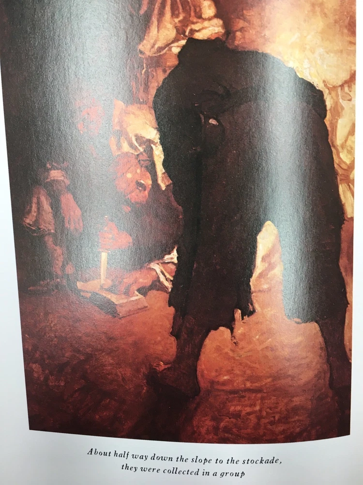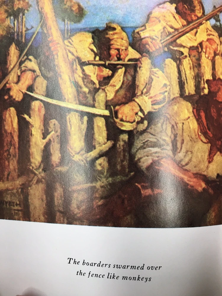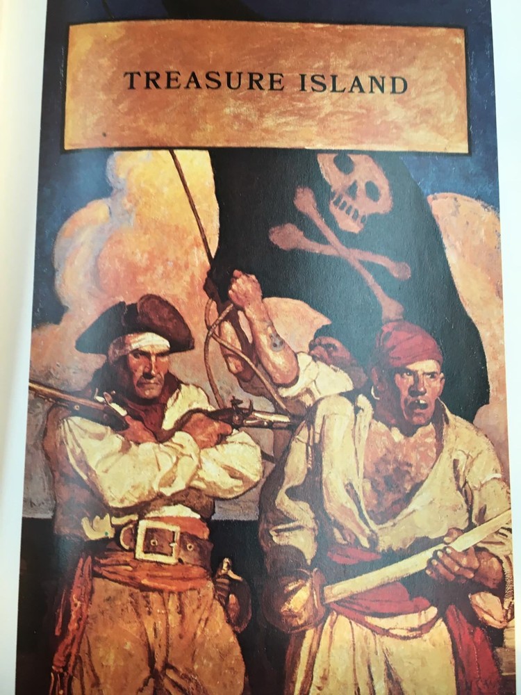 Franklin Library leather edition of Robert Louis Stevenson's "Treasure Island," a Limited edition, Illustrated by N.C. WYETH, one of the 100 GREATEST BOOKS OF ALL TIME series, published in 1975. Bound in a navy-blue leather, the book has scarlet red French moire silk end leaves, hubbed spine, Symth-sewn binding, acid-free paper, satin book marker, gold gilding on three edges--in near Fine condition. Robert Louis Balfour Stevenson, who lived from 1850---1894, was a Scottish novelist, poet, essayist, and travel writer. An old sailor, calling himself "the captain"—real name "Billy" Bones—comes to lodge at the Admiral Benbow Inn on the west English coast during the mid-1700s, paying Bob the innkeeper's son, Jim Hawkins, a few pennies to keep a lookout for a one-legged "seafaring man." A seaman with intact legs shows up, frightening Billy—who drinks far too much rum—and has another stroke and dies; Jim and his mother unlock the sea chest, finding some money, a journal, and a map. The local physician, Dr. Livesey, deduces that the map is of an island where a deceased pirate—Captain Flint—buried a vast treasure and the search is on! Jim becomes involve in the quest. Silver and some of the others go ashore, and two men who refuse to join the mutiny are killed. Exhausted, Jim falls asleep in the boat and wakes up the next morning, bobbing along on the west coast of the island, carried by a northerly current. Eventually, he encounters the ship, which seems deserted, but getting on board, he finds O'Brien dead and Hands badly wounded. As the ship is finally beached, Hands attempts to kill Jim but is himself killed in the attempt. Silver and the others argue about whether to kill Jim, and Silver talks them down. He tells Jim that, when everyone found the ship was gone, the captain's party agreed to a treaty whereby they gave up the stockade and the map. In the morning, the doctor arrives to treat the wounded and sick pirates and tells Silver to look out for trouble when they find the site of the treasure. After he leaves, Silver and the others set out with the map, taking Jim along as hostage. They encounter a skeleton, arms apparently oriented toward the treasure, which seriously unnerves the party. Eventually, they find the treasure cache—empty. Two of the pirates charge at Silver and Jim but are shot down by Livesey, Gray, and Gunn, from ambush. The other three run away, and Livesey explains that Gunn had already found the treasure and taken it to his cave. Silver steals a bag of money and escapes. The rest sail back to Bristol and divide up the treasure. Jim says there is more left on the island, but he for one will not undertake another voyage to recover it. 305 pages. I offer Combined shipping.