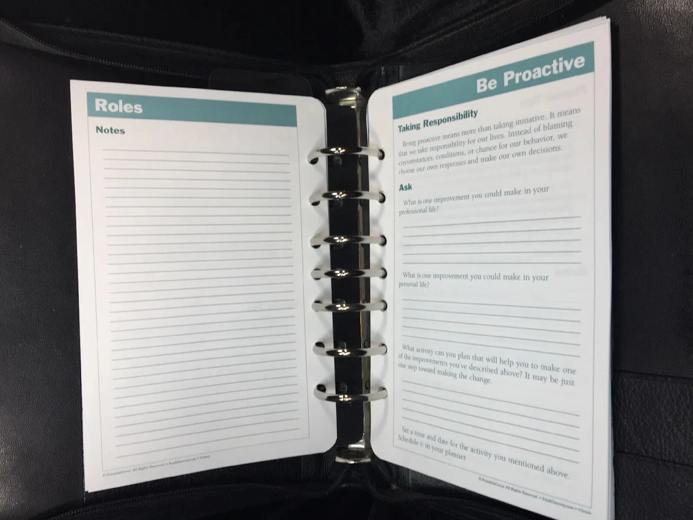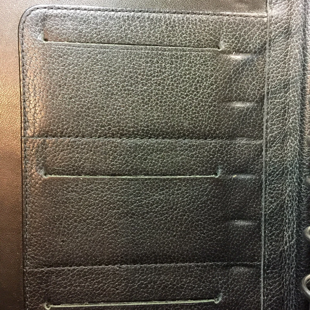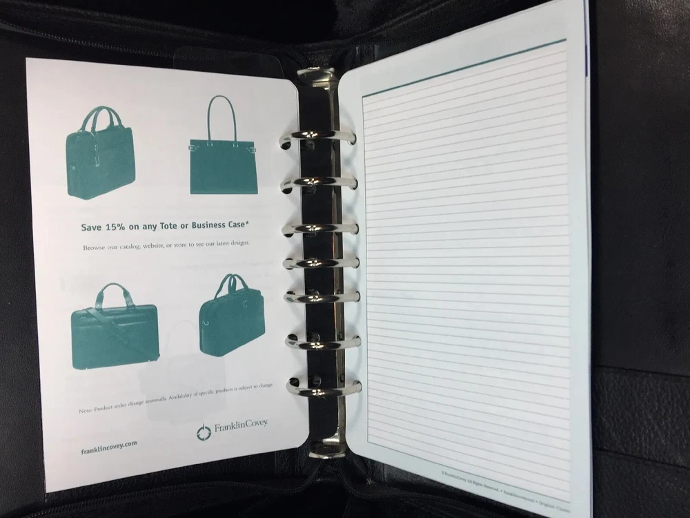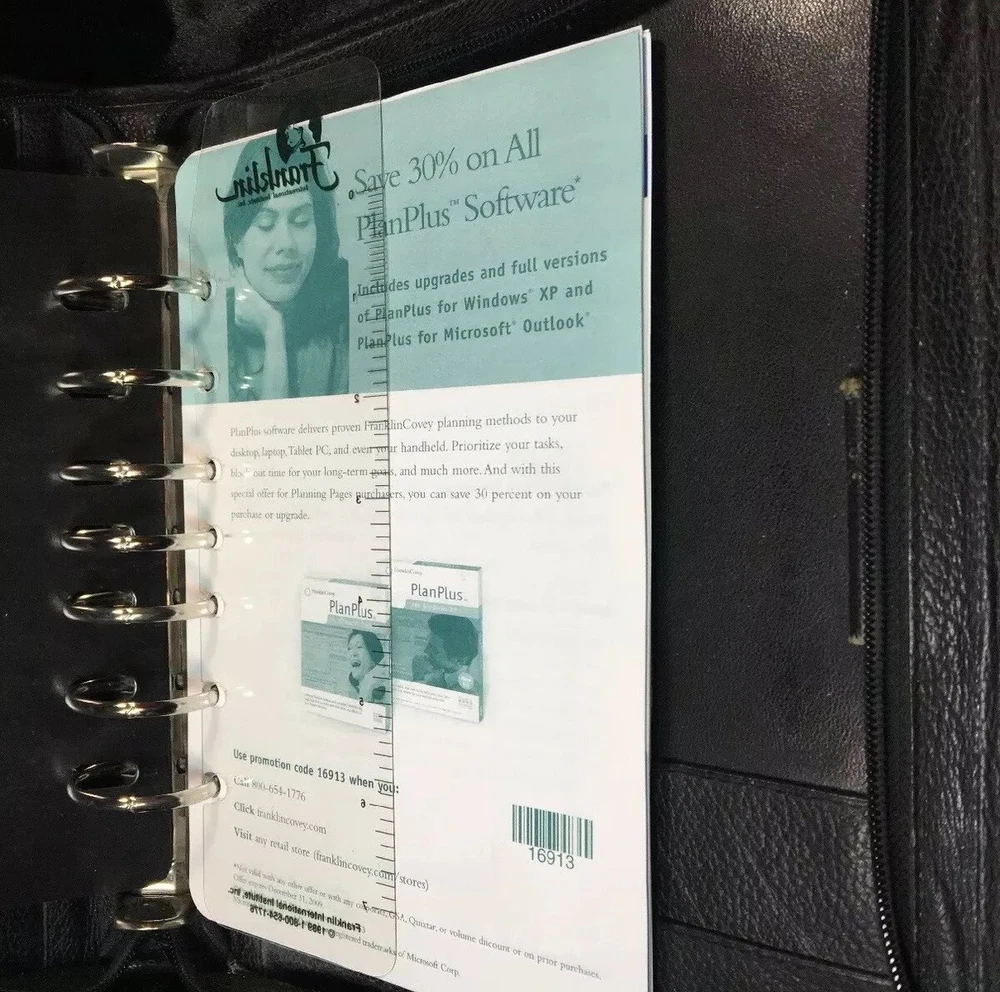 Vintage Franklin Quest Black Planner Journal Calendar 7- 1.5” rings CL4044 USA. Condition is Used. Shipped with USPS Priority Mail. Franklin Quest Binder Top Grain Black Leather 7 Rings USA~ Vintage Good pre-owned. Signs of previous wear and use. Zip around leather binder in black. Measures:- 11" H x 9" W x 2" D. Holds pages 5.5" x 8.5". Seven 1.5" W Rings. - Made of Top Grain Leather. - Interior Left Side - 1 medium size side entry slip pocket, 2 small inserts 2 pen holders- 1 on each side Ruler - Interior Right Side - 1 larger expandable slip pocket and 2 lower business card slip pockets. All items are professionally packed for safe arrival. Thank you for visiting my shop. Please choose “Ingebjorg” as a favorite shop to see new listings every day! Enjoy your purchase. US bookcase