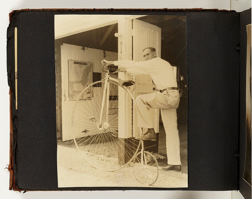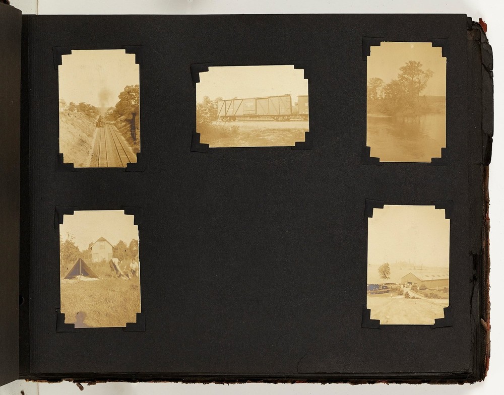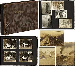 [Photo Album]: New Jersey Family Album with Emphasis on Transportation Author: ROSENKRANZ, Frieda and H.J. Title: [Photo Album]: New Jersey Family Album with Emphasis on Transportation Publication: Bloomfield, New Jersey, Queens, New York: 1900-1960 Description: Softcover. Oblong quarto. String-tied brown flexible leather with "Photographs" stamped in gilt on the front cover measuring 12" x 10.5". Very good minus with tears, loose pages, and lacking some photos. A collection of 159 photographs taken by New Jersey photographer H.J. Rosenkranz of his family,and friends, among other things, from the turn of the century until around 1960, mostly uncaptioned. The assembled photos range from landscape shots of rural New Jersey and the surrounding area, people posing on benches, in their house, and outside in various locations. Pictured are photos of a biplane in flight, an elaborate double-decker bus with a spiral staircase, and horse drawn carts full of straw baled by farmers. The album also contains beautiful large shots of train yards and locomotives. There are also some professional family portraits, weddings photos, and new baby. Laid in is a Rosenkranz business card as well as a prayer card for Frieda Rosenkranz, though it is unclear whether she was a wife or daughter. Some of the later images are in color including a trip to Washington DC, complete with cherry blossoms, and one of a man posing on his land and a older woman by a gravesite. A nice assortment of vernacular images from a minor professional photographer from New Jersey capturing 60 years of his history. Seller ID: 393395 Between the Covers Between the Covers has been selling books for more than 30 years. Today we offer a wide ranging inventory, from Modern First Editions to General Used Books to Rare Archival Collections. We are active members of the Antiquarian Booksellers' Association of America (ABAA) and the International League of Antiquarian Booksellers (ILAB) . Terms All orders ship within two business days. Standard mail is USPS Media Mail. Expedited and international shipping are also available. We offer combined shipping on multiple orders. All books are guaranteed to be as described or they may be returned within 30 days of receipt for a full refund. This listing was created by Bibliopolis.