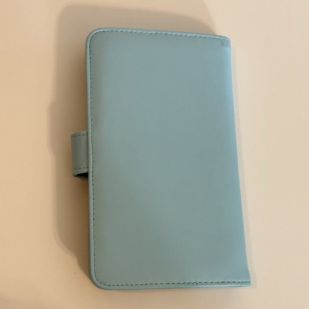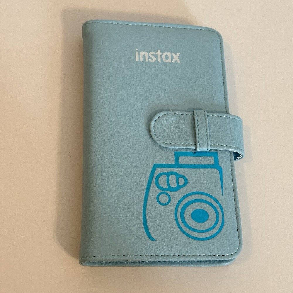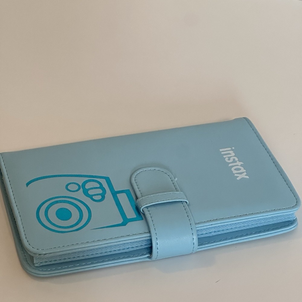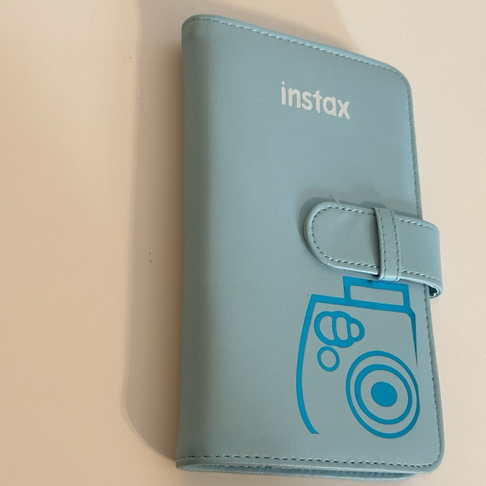 This album is in like new condition and has no rips, stains, or damage. It only had 3 photos in it and was stored in a climate controlled drawer. It is a light icy blue color and has a white instax logo with a shiny blue camera on the cover. It has a slip closure that latches closed on the side and is made of a faux leather material. The inside cover has one small pocket to hold extra photos and the pages are made of a sturdy plastic material. Each page holds 3 photos front and back to hold a total of 72 photos. This works with the fujifilm instax mini photos which are 8.6cm x 5.4cm.