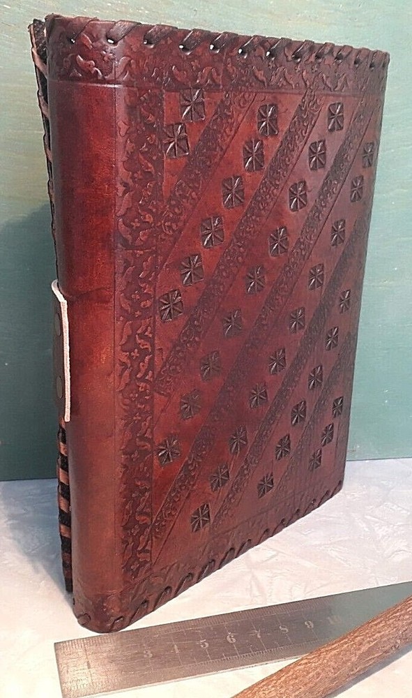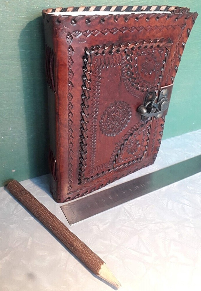GENUINE Embossed LEATHER BOUND NOTEBOOK/DIARY (with C-lock clasp) EACH OF OUR LEATHER NOTEBOOKS HAS BEEN HAND CUT,HOLED AND BOUND USING TRADITIONAL LEATHER CRAFTING AND BOOK BINDING SKILLS . THEY ARE FINISHED WITH NATURAL VEGETABLE BASED DYES, AND LIGHTLY BUFFED TO GIVE AN ANTIQUE LEATHER BOOK FINISH. THE INSIDE PAGES ARE MADE WITH HANDMADE PAPER IN 1 VARIATION; 1, UNBLEACHED(Cartridge/Sketch paper), THE PAGES are in 5 attached booklets ranging from a total of 80 to 100pages(160-200 sides) THESE BEAUTIFUL BOOKS COME IN 1 SIZE and 1 Embossed design; LARGE: LENGTH= 20 C.M. WIDTH=16 C.M. DEPTH= 4 C.M. PLEASE NOTE: WE USE ONLY WATER BUFFALO and COW HIDES, and GOATSKINS from OLD DAIRY ANIMALS that are PAST a USEFUL AGE or FALLEN (Naturally Dead). THERE ARE NO ANIMALS BRED AND SLAUGHTERED FOR THE PURPOSE OF PRODUCING LEATHER FOR OUR JOURNALS. OUR LEATHER is TANNED with TREE BARK and FINISHED with a NATURAL VEGETABLE DYE in STARK CONTRAST to using CHROME TANNING which is HIGHLY TOXIC,WATER POLLUTING and known to be CARCINOGENIC. THIS NATURAL DYE CAN LEAVE A SMALL RESIDUE ON THE SURFACE OF THE LEATHER WHICH MIGHT COME OFF ON YOUR HANDS ON FIRST HANDLING OF THE BOOK. THIS IS TOTALLY HARMLESS AND WILL STOP IN TIME WHEN THE DYE STABILISES. WE HOPE YOU AGREE THAT THIS IS A SMALL PRICE TO PAY TO HELP REDUCE THE POISONING OF OUR ENVIRONMENT. We are a Fair Trade Company, and as such ensure that we visit all out suppliers personally to check the working conditions of the people making our products before placing any order. None of our suppliers ever has to borrow money to fullfil our orders, as we never return products or withhold payment. We deal only with small family firms, and this has given us the wonderful opportunity over the years to see them prosper and grow their businesses. We strive to invest in Eco-Friendly and Re-cycled products whereever possible, with the aim of reducing our impact on the environment. We hope you enjoy our products as much as we have enjoyed bringing them to you.