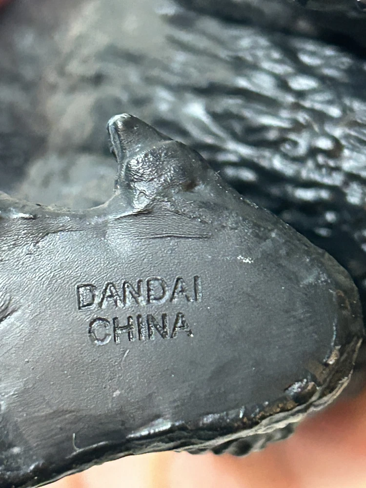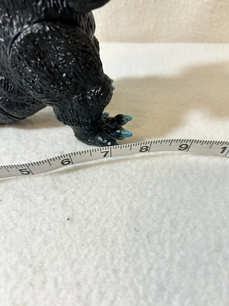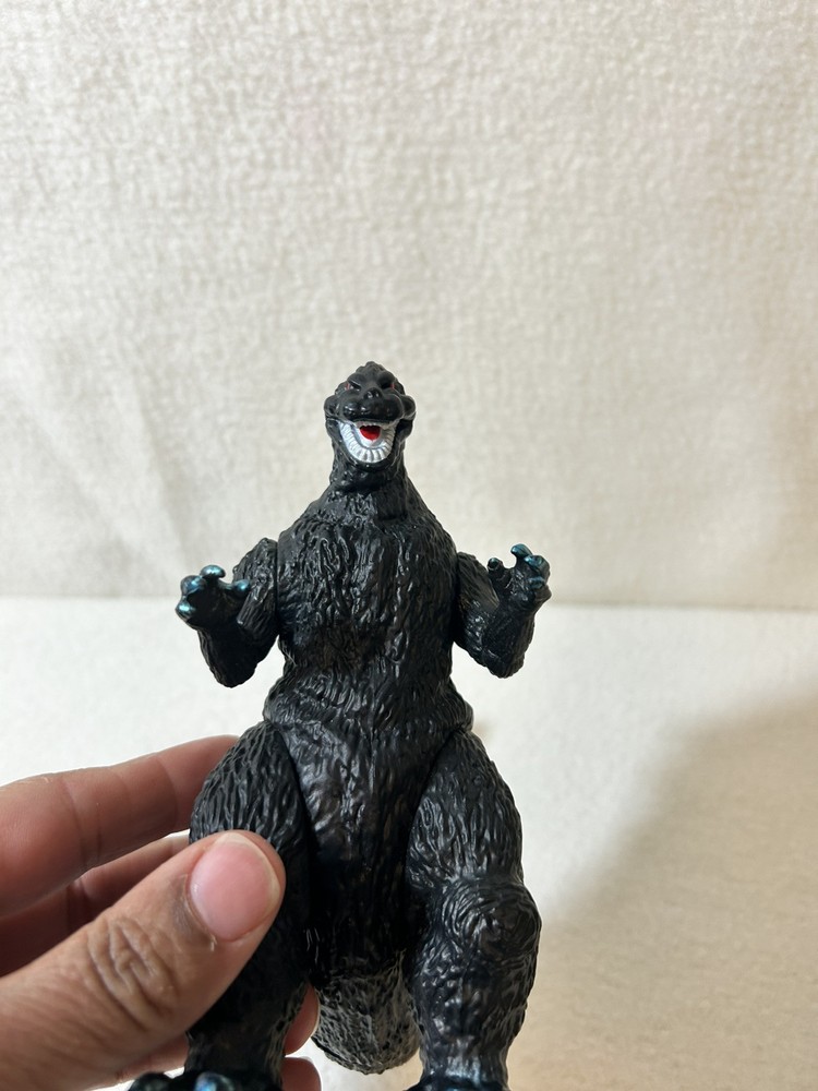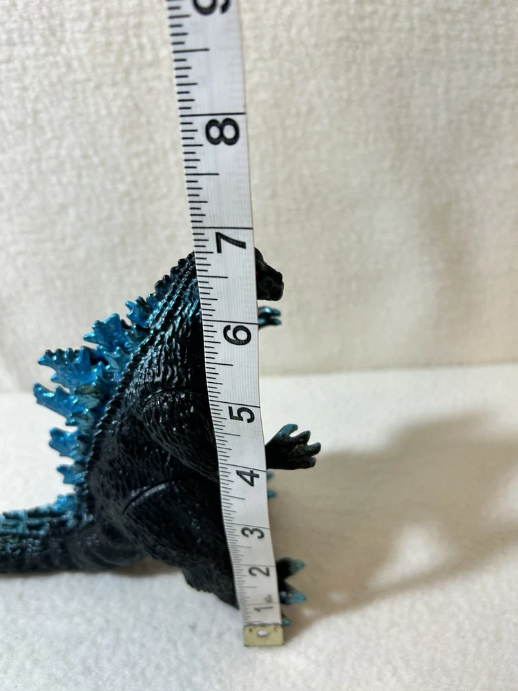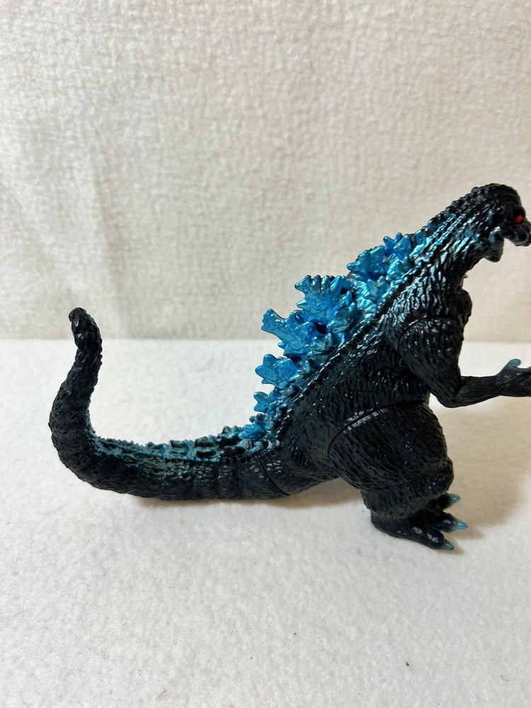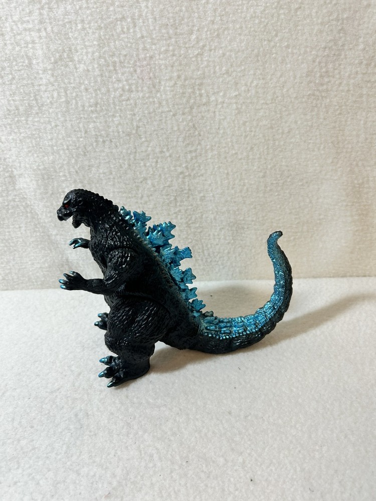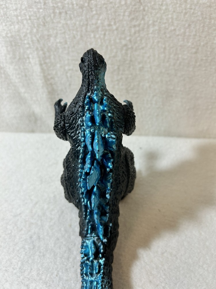 This is a vintage 1965 Godzilla movie monster vinyl figure made by Bandai in 2003. The figure features blue scales and spikes, staying true to the original design. It is based on the iconic monster character from the Godzilla franchise, specifically from the 1965 movie. Made of vinyl material, this action figure is a collectible piece for fans of TV, movies, and video games. Good condition