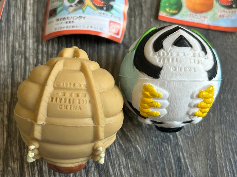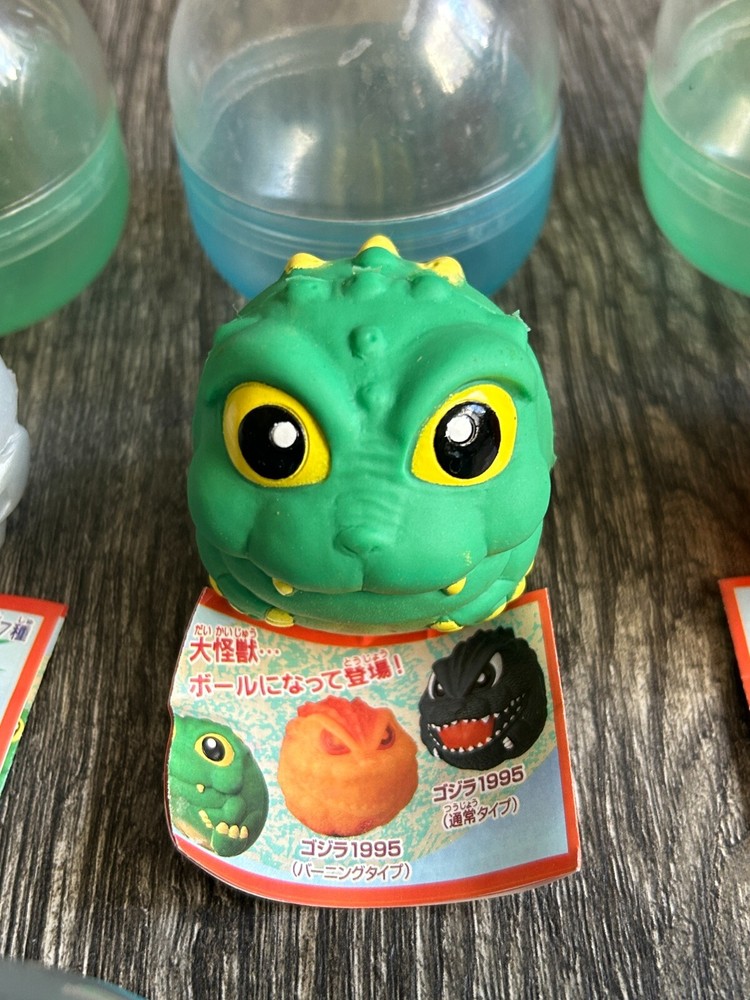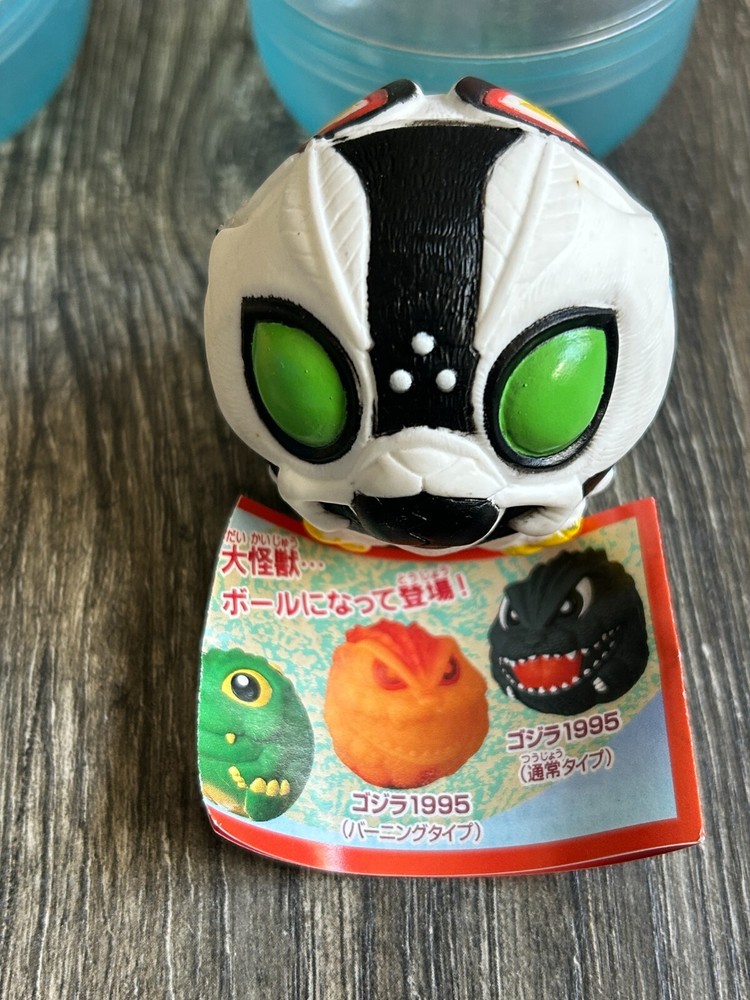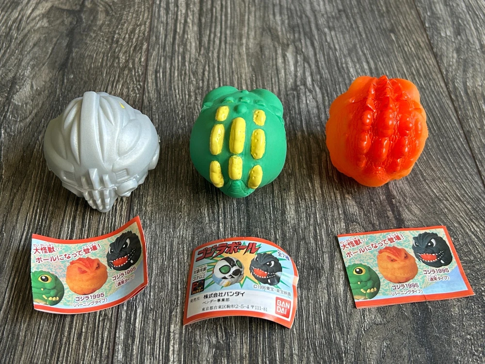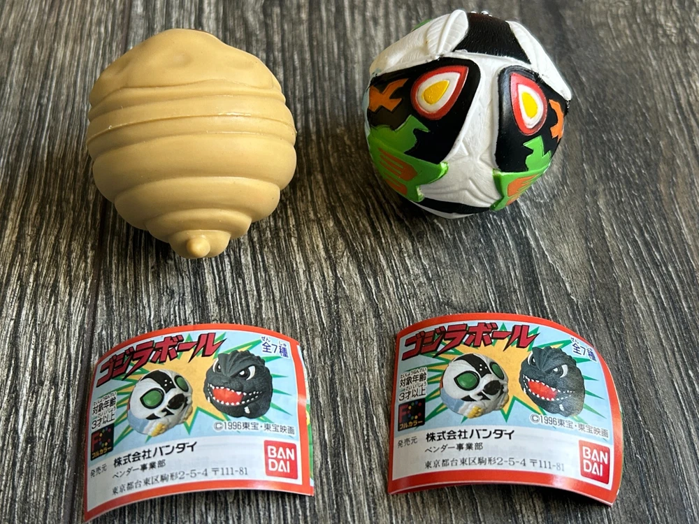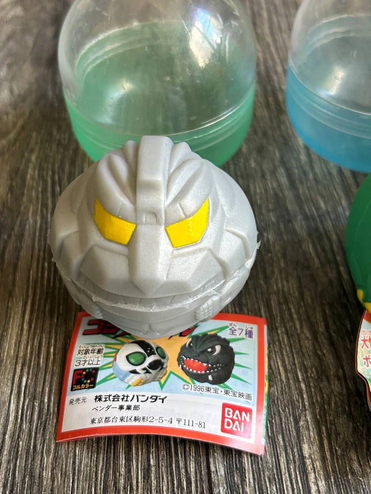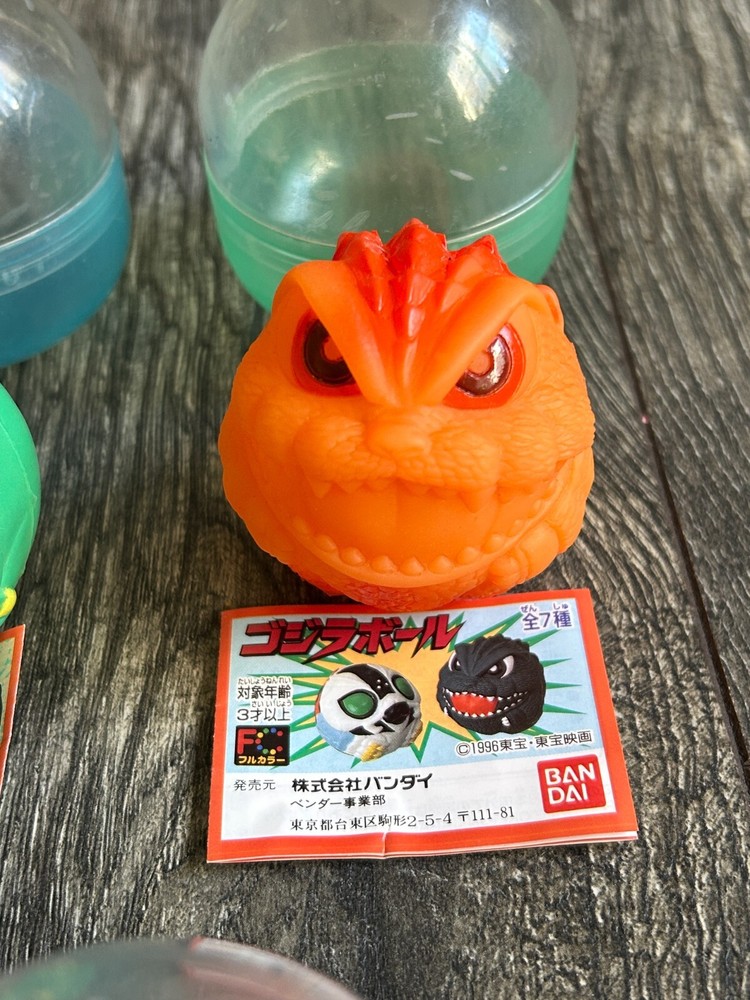 GODZILLA Ball Gashapon Toy 5pc Lot Bandai Japan Japanese 1996 contains Burning Godzilla + Minya (Godzilla Son) + Mothra + Mothra Larvae + Mecha Godzilla - all with inserts in fantastic unused condition from smoke free pet free home. Vinyl shaped balls measure about 2 1/2" in diameter. Come with original plastic shells. Check out the other vintage Godzilla items I have listed! Please mouse over and zoom in on all hi-res photos! This item will be packaged VERY well. Payment is due within 24-48 hours purchase. If this doesn't work for you, please message me before you buy for approval. Unless other arrangements have been made, transaction will be cancelled due to buyer non-payment at the end of the 4th day.
