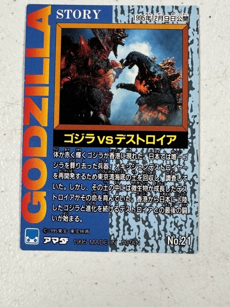 Godzilla vs. Destroyah Prism Card, #21, Amada, Toho, 1995 Vintage Near Mint Pictures show some reflections and shadows from lights Please review pictures as they are part of the description from a smoke pet free home Unless otherwise noted items ship out within one business day. Due to the continued unknown variables of today's delivery systems, we continue to strive in our excellence to bring you prompt and professional shipment of your purchase.