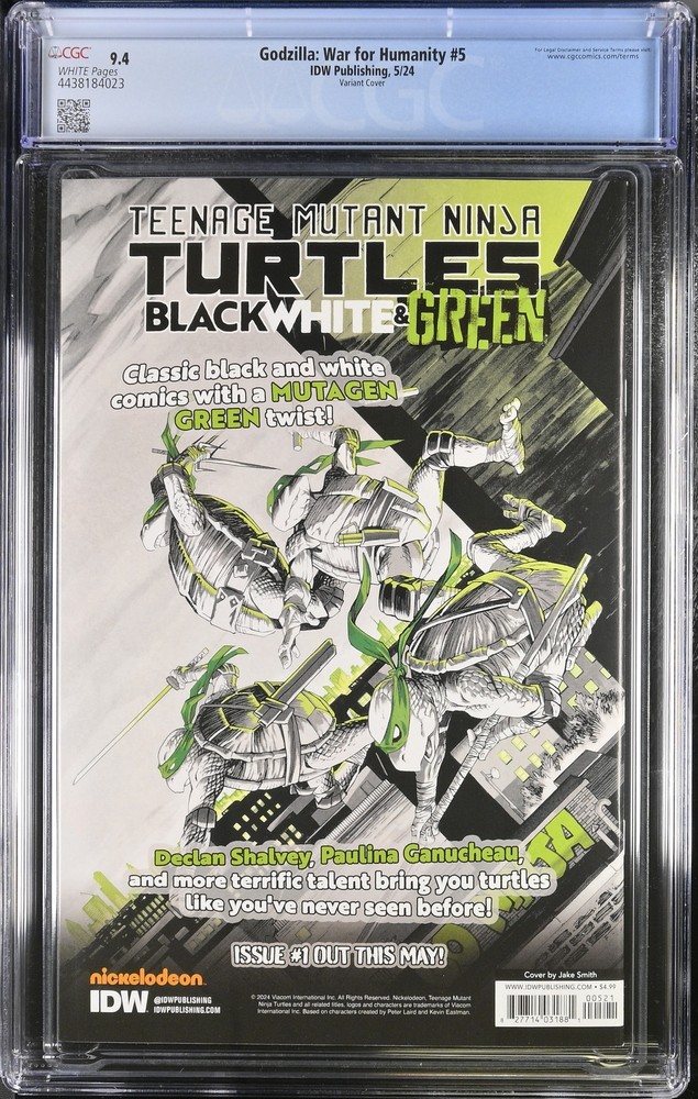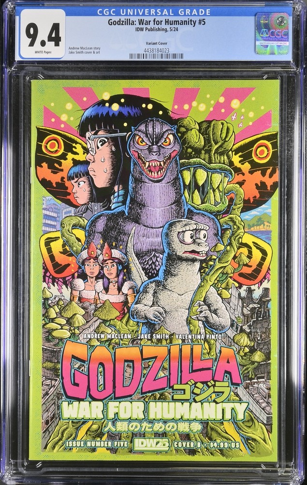 GODZILLA: WAR FOR HUMANITY # 5 : COVER: B - JAKE SMITH VARIANT IDW PUBLISHING | RELEASE DATE : 5/1/2024 | COVER YEAR: FORMAT: COMIC | AGE: MODERN | PAGES: 32 WRITER: ANDREW MACLEAN COVER ARTIST: JAKE SMITH ARTIST: JAKE SMITH PROFESSIONAL GRADING: GRADE: 9.8 NEAR MINT/MINT GRADING COMPANY: CGC SS GRADING CERTIFICATION NUMBER: 4438184023 PLOT: GODZILLA ALONE?! ZOOSPORA CONTINUES TO SPREAD ITS ROOTS ACROSS THE WORLD, AND WITH THE KAIJU TASK FORCE NEARLY OUT OF COMMISSION AND GODZILLA THE ONLY ONE LEFT STANDING AGAINST AN ARMY OF MONSTERS, IT LOOKS LIKE HUMANITY IS DOOMED! IN A LAST-DITCH EFFORT, YUKO AND SAMANTHA BEGIN TO SEARCH FOR ZOOSPORA'S SOURCE AND ANY CLUE TO DEFEATING THE SEEMINGLY UNSTOPPABLE MONSTER! ARE YOU LOOKING FOR SOMETHING SIMILAR? SEE OUR OTHER ITEMS! SHOW MORE ITEMS · Please contact us with any questions or for additional pictures on items · Items ordered and delivered outside the US will be shipped through eBay International Shipping . Search the HELP pages for program operations and eligible counties. · All comics are bagged and boarded unless otherwise specified (i.e. Top Loader included, Graded comics) · All comics are shipped in comic mailers or comic shipping boxes and are boarded, bubble wrapped and secured for safe shipping. Items are shipped via Medi Mail or USPS Ground Advantage. If you require additional shipping requirements, please send a message with the order number and requested specifications. We will attempt to fulfill any additional requests, but surcharges may apply (expedited shipping, signature confirmation, insurance, etc.) · Payments are only accepted via eBay Managed payments, please do not request payments outside the eBay platform. · Returns: 14-day domestic / 30-day returns internationally through eBay International Shipping. For domestic returns, please contact us directly before opening a claim on eBay so we can assist in resolving any issues via a reship or partial/full refund. For international returns, please open a claim via eBay to align with eBay International Shipping returns. EBAY LINKS: OUR STORE | FEEDBACK | ABOUT US | CONTACT US