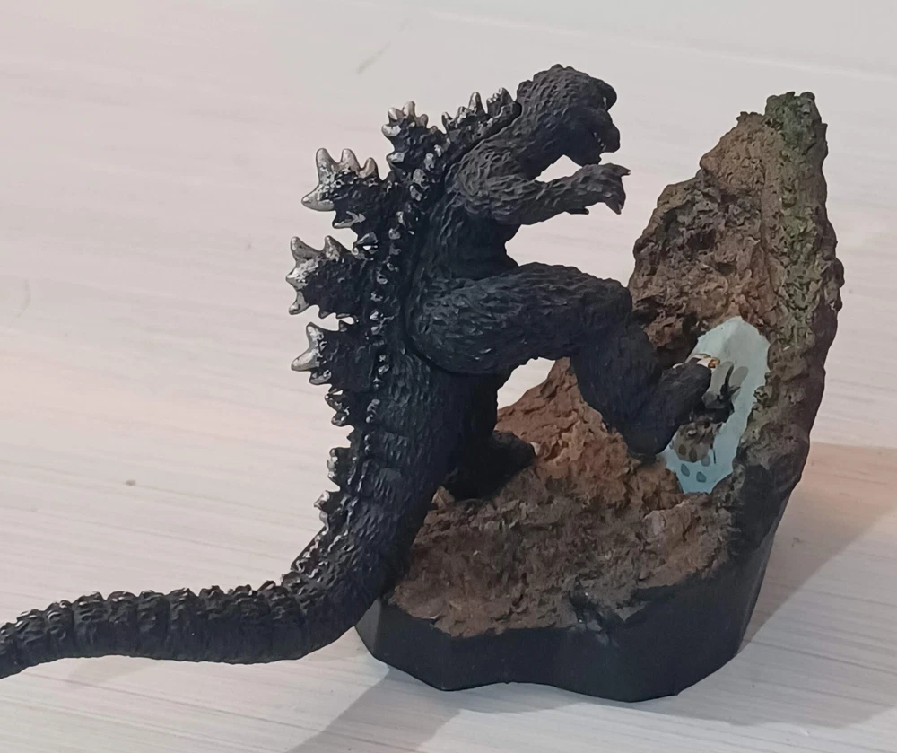 GODZILLA stomping on mystery thing! What is he stomping on? Excellent condition. MFG 2006. GO GO Godzilla! SIZE: 3 inches wide, 3 inches tall, 5 inches long (from edge of display stand to tip of tail)