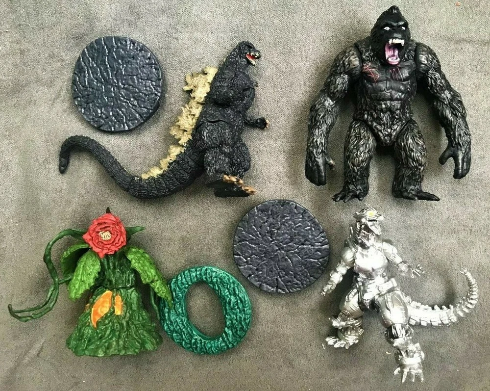 You are bidding on a set of monster figures from GODZILLA. You get GODZILLA, MECHA-GODZILLA, KING KONG, and BIOLLANTE. You also get stands for Biollante, Godzilla, and Mecha-Godzilla. Figures range in size from 3" to 4". Your figures arrive NEW - NEVER PLAYED WITH! You get ALL FOUR figures!
