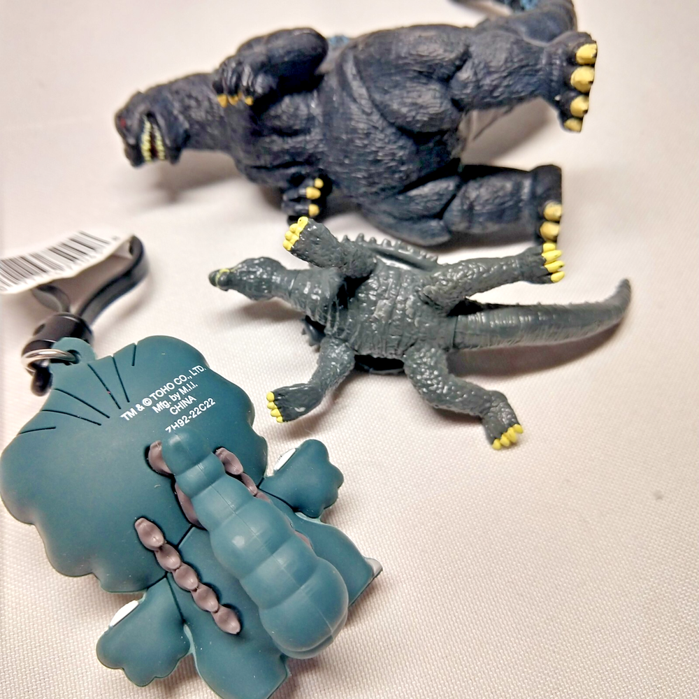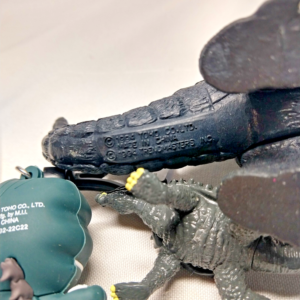 Godzilla items. Six pieces, all shown in the first picture. Includes a Series 4 rubber bag clip with tag, 1998 Kaiju figure missing head piece, a 1994 4" figure from Trendmasters in NM condition, Mecha Godzilla figure, 1998 Taco Bell toy and a 2" Chibi figure from 2013, excellent condition. Now includes another small Mecha Godzilla (that does not come apart) shown in the last picture.