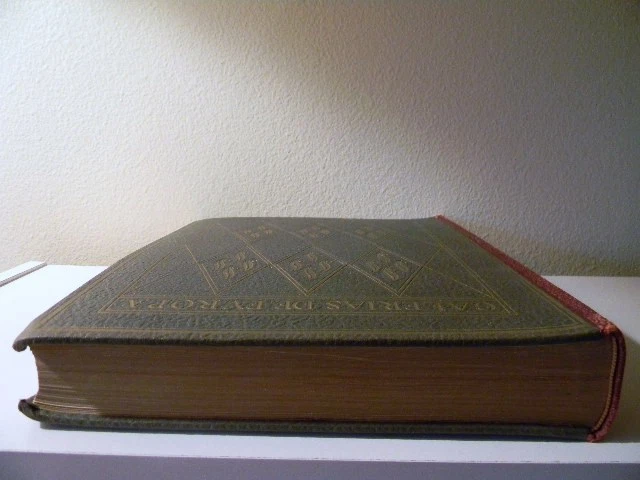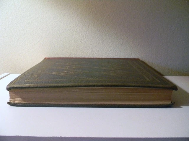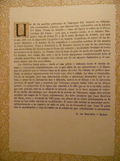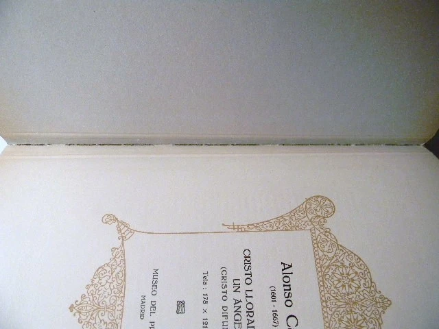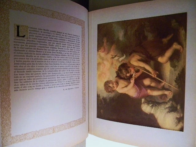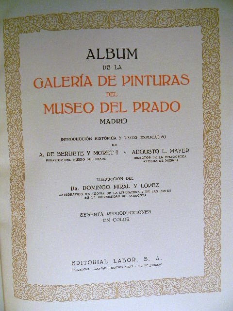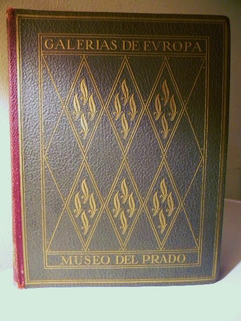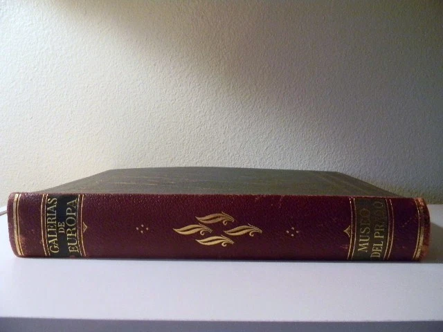 This is Album de la Galería de pinturas del Museo del Prado Madrid (Album From The Gallery Of Paintings Of The Prado Museum, Madrid). Published by Barcelona etc., Editorial Labor, S.A. 1950. This large, beautiful book is filled with 60 gorgeous tipped in color plates of paintings in the Prado museum in Madrid, Spain. Plates are attached to heavy, card stock paper. Each plate is preceded by a short note about the artist and a page of text about the painting. Book is in excellent condition with the only issues found being mild rubbing along spine, mostly at head and foot. Small mark on bottom edge. Hinge is starting on plate 25. Dark greenish/gray leather boards with gilt design and text. Maroon, black and gray leather spine, also with gilt design and text. Size is approximately 12.75" X 10" X 2" and weight is slightly over 6lb. Please note that the text in this book is written in Spanish. Please see pictures. Choose priority shipping for faster delivery! Thank you.