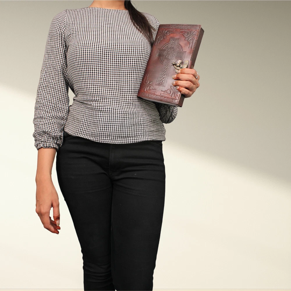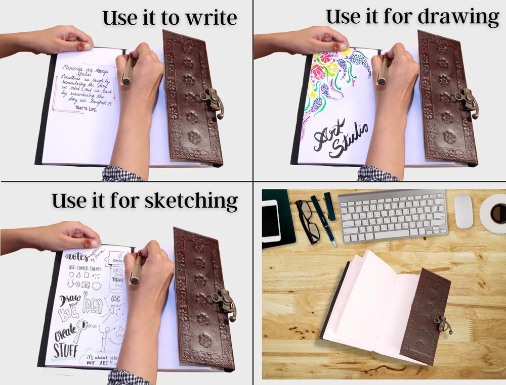ELEVATE YOUR JOURNALING EXPERIENCE WITH OUR LEATHER BOUND DIARY: Indulge in the art of journaling and elevate your personal or professional life with this genuine leather bound journal. Our journal features full grain leather cover that exudes elegance and durability. With a minimalist cross design and clasp closure this journal offers a perfect balance of form and function. Sized to fit comfortably in your bag or backpack, this journal is perfect for writers, artists, students, or anyone who values the art of jotting down their thoughts on paper. It's equally suitable for travel, meetings, or everyday journaling. Inside, you'll find smooth, acid-free, and archival-quality paper that ensures your writings won't fade or deteriorate. Each page is a canvas for your thoughts, ideas, sketches, or memories. ORDER YOUS NOW! SIZE: Height: 9“ (23 cm) | Length: 6“ (15 cm) | Width: 3“ (8 cm) SPECIFICATIONS: Genuine full-grain leather Handmade Clasp closure Cross embossed Country of origin: India 200 Pages NOTE: 100% Genuine leather diary. Color may slightly vary from pictures. Paper used in diary are 100% recycled cotton acid free paper.