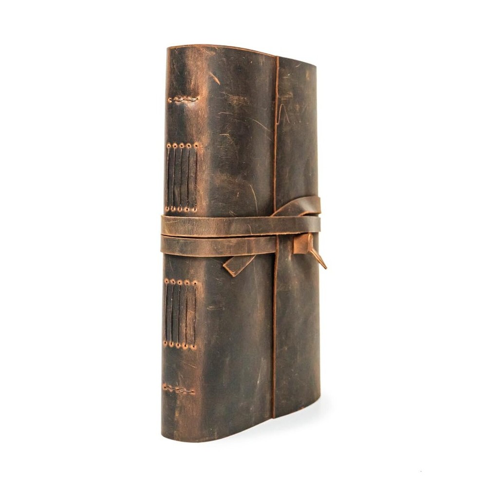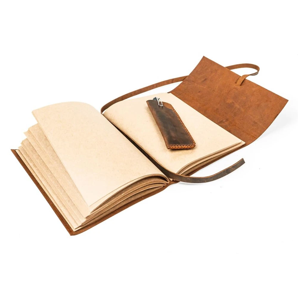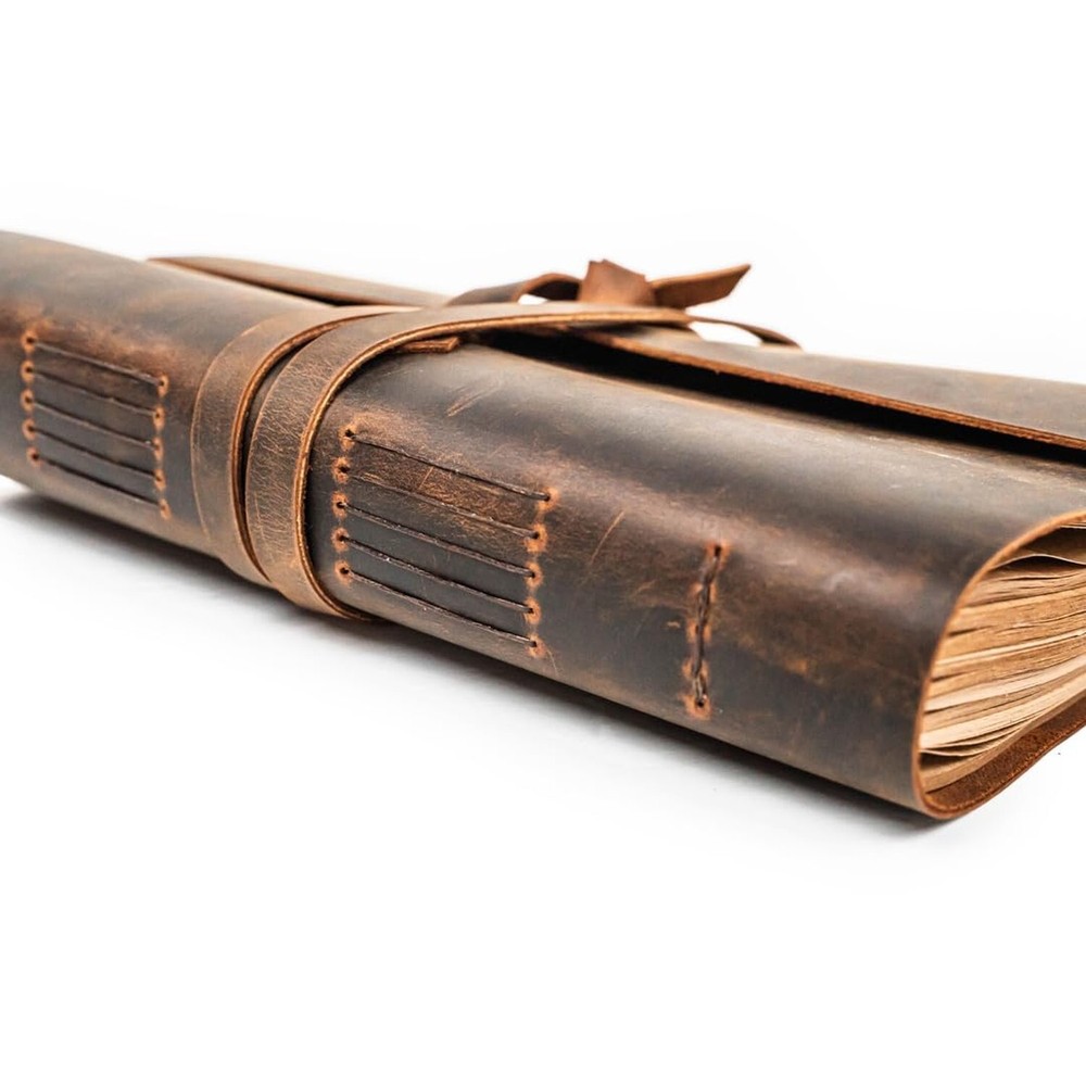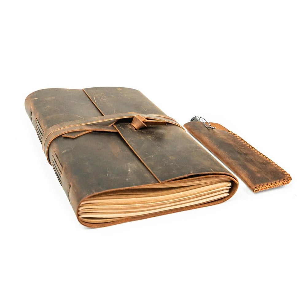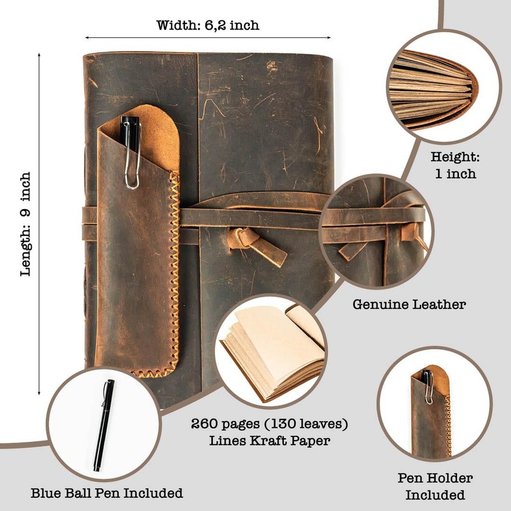 Genuine Leather Bound Writing Journal For Men & Women 260 Kraft Unlined Pages Handmade Vintage Brown 6x8 Product Details Size: 6"x8" Color: Vintage Brown Brand: HATIRA MPN: LJ-100 EAN: 8682835940281 UPC: Does not apply Brand: HATIRA Color: Vintage Brown Theme: Book Sheet Size: A5 Pages: 260 Pages Cover Material: Leather Style: Vintage Ruling Type: Plain Special Feature: Soft cover Number of Items: 1 Brand: HATIRA Item Weight: 1.34 pounds Product Dimensions: 8.46 x 6.1 x 1.18 inches Item model number: LJ-100 Color: Vintage Brown Cover Material: Leather Number of Items: 1 Size: 6"x8" Ruling: Plain Sheet Size: A5 Manufacturer Part Number: LJ-100 Date First Available: October 8, 2023 Genuine Leather, Real Journals : Crazy Leather is genuine fine finished calfskin. Various scratches on it give the leather an aged look. The more you use, the scratches will start disappear and a smooth and shiny surface will reveal itself. You can also apply beeswax or petroleum jelly if you prefer a fast solution for a smooth surface. The pages of the handmade leather notebook are hand-glued to the leather cover using the long-stitch binding method with durable waxed thread. The Right Size You're Looking For: We sized our leather journals for different needs. Small enough to fit in a small bag, big enough to capture your every moment as a diary, composition notebook, sketchbook or scrapbook. A good gift idea, because it is pre-packaged! : Gift yourself or a loved one with this handmade leather notebook, a treasure that transcends utility, becoming a cherished keepsake. Elevate your writing experience with this unique blend of artistry and functionality, where every stroke of the pen is met with the embrace of genuine craftsmanship. Different options for men, women, traveler, artists, students, coworker etc. : The leather notebook is offered in a variety of colors and sizes, addressing to various needs. With two size options - 5X7 and 6X8 as well as ten color option. A Set of Gifts : Your leather journal will come with a same color double pen case + a blue ball pen! Your gift pen will glide on the 90 gram unlined kraft page while you are enhancing writing skills.
