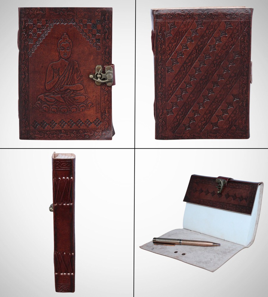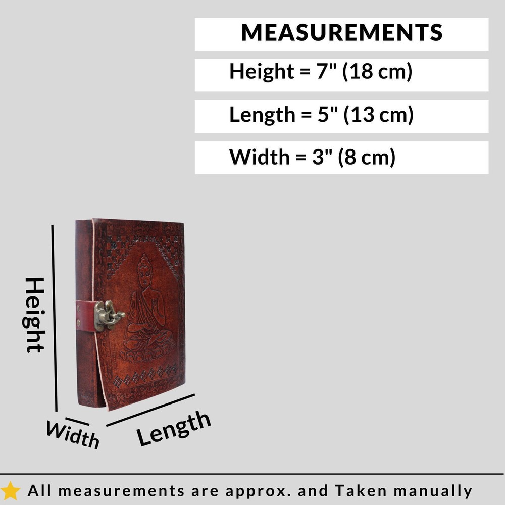 Welcome To MADOSH (Brand: Madosh- Mad Over ShoppingTM) Immerse yourself in a journey of serenity with our Leather Lord Buddha Journal, a divine creation that seamlessly combines spirituality with the art of journaling. The intricately embossed Buddha design on genuine leather serves as a constant reminder to embrace tranquillity in your writing. Perfect for journaling, meditation notes, or as a meaningful gift, this journal is designed to be a companion on your path to self-discovery. Dimension: Height:7" (18 cm) | Length: 5" (13cm) | Width: 3” (8 cm). Features: Genuine leather Gautama Buddha Embossed Clasp closure 100 sheets (200 pages) Country of origin: India Note: It is handmade and made by professional artisans. 100% Genuine leather diary. 100% recycled cotton and acid free paper used in diary.
