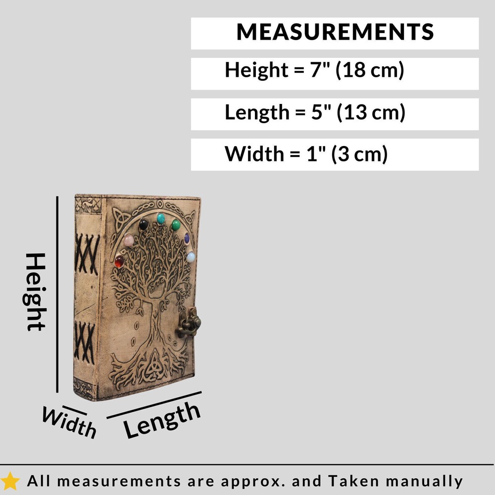 Welcome To MADOSH (Brand: Madosh- Mad Over ShoppingTM) Elevate your writing experience with our Premium Leather Tree of life seven stone leather journal. Crafted with meticulous attention to detail, this exquisitely designed diary is the perfect companion for those who appreciate the finer things in life. Whether you're a writer, artist, or simply someone who loves putting pen to paper, this diary is you’re for creativity and self-expression. Your private thoughts are safeguarded by the secure brass clasp closure. Not only does it add a touch of rustic charm, but it ensures that your diary stays closed, protecting your secrets. It also makes an exquisite gift for loved ones who appreciates the beauty of craftsmanship and the art of writing. Order your enchanted leather-bound grimoire spell book today and start your journey into the realms of magic, where your words and intention have the power to shape reality. SIZE: Height: 7“(18 cm) | Length: 5“(13 cm) | Width: 1“(3 cm) SPECIFICATIONS: Genuine full-grain leather Handmade Clasp closure Stone studded tree embossing Country of origin: India 200 Pages NOTE: 100% Genuine leather diary. Color may slightly vary from pictures. Paper used in diary are 100 % recycled cotton acid free paper.