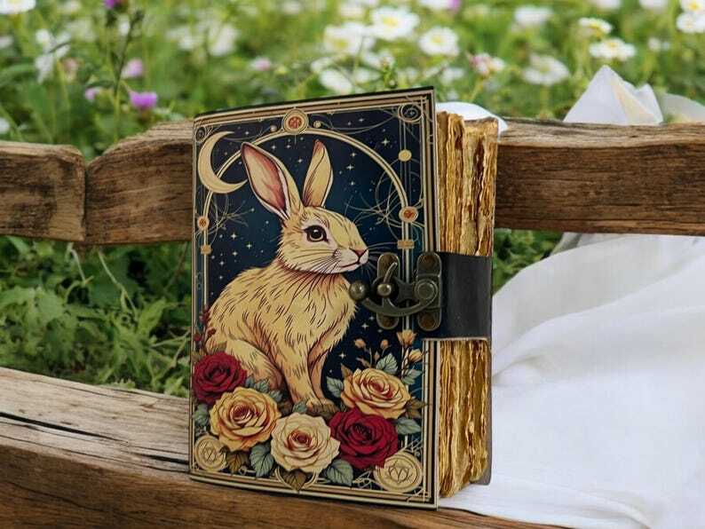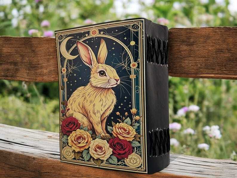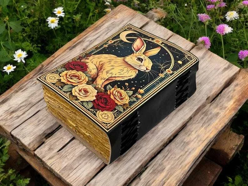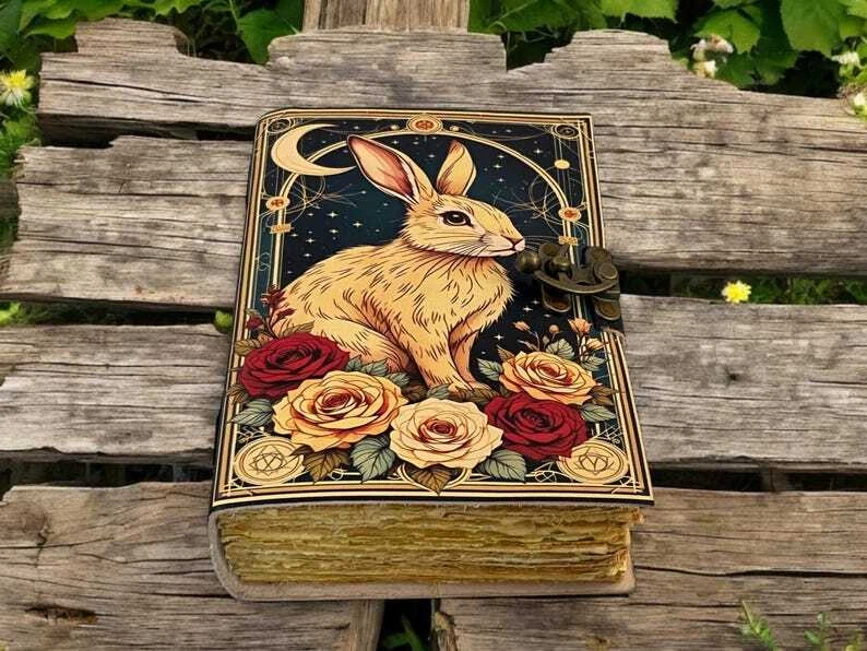 Bunny rabbit Grimoire Leather Journal Notebook Journal for women Fat journal handmade Deckle Paper Notebook Journal for gift • Leather Journal Rustic vintage leather • C-Lock brass • genuine buffalo leather • vintage deckle edge old paper. > Size - 7x5 Inches, 8x6 Inches, 10x7 Inches ● The vintage lock will keep all your valuable writing locked inside. Study hand stitched binding to make sure that no paper comes out loose from your vintage notebook. ● Vintage Journal is made of unique vintage paper which looks like it was pulled from history. You will love the old looking handmade cotton paper which is unique to our vintage journals. ● Sketchbook is great for keeping by the bedside to jot down dreams, or for use as a diary or journal. ● It is a truly unique and wonderful gift for a friend, the men, women, and wiccans in your life! or to treat yourself to as a special keepsake