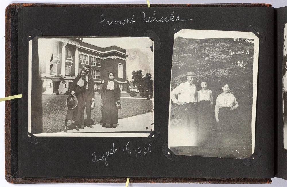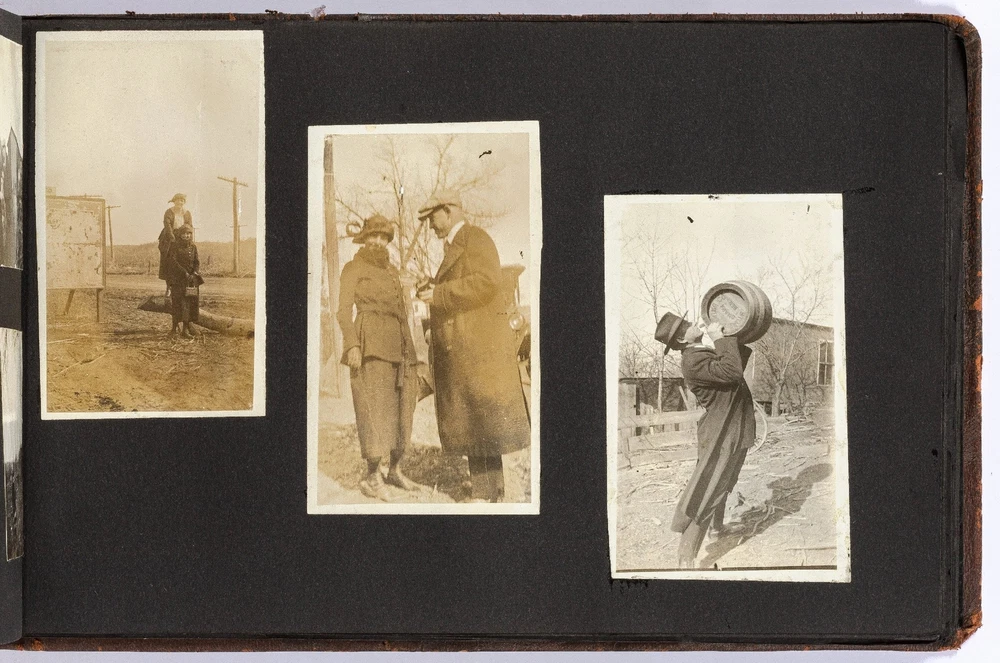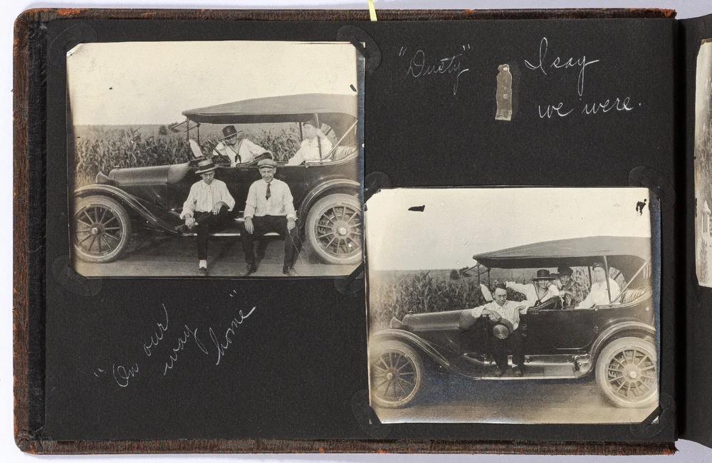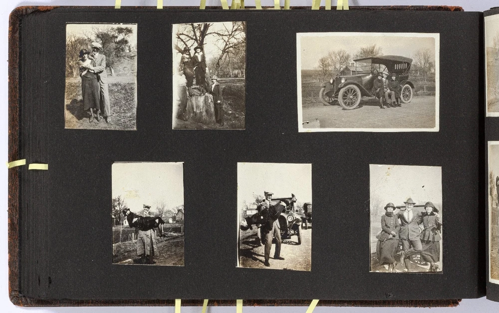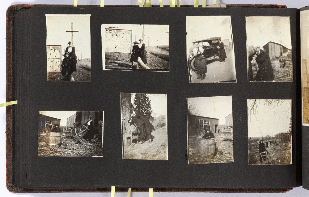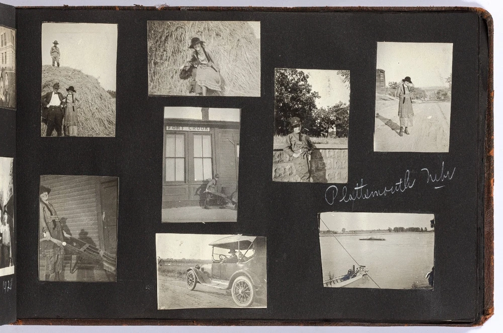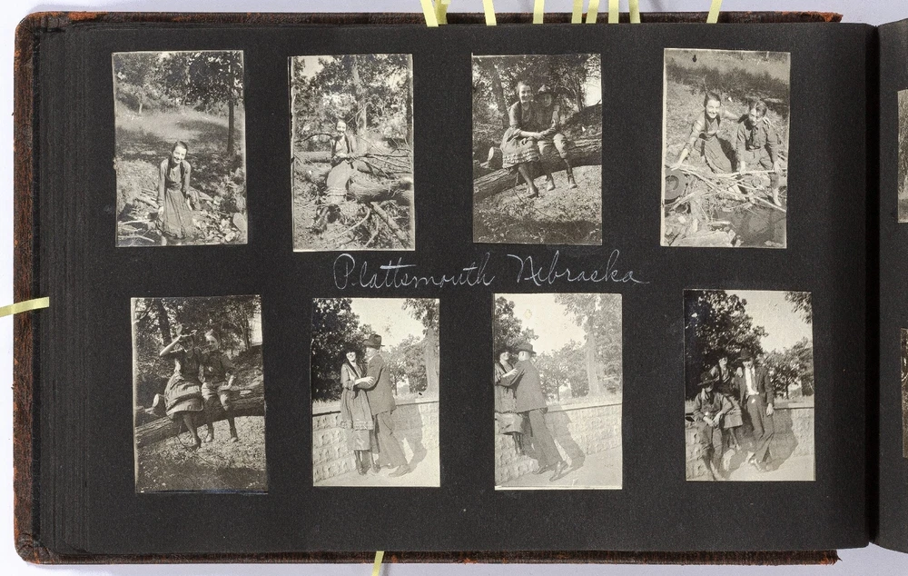 [Photo Album]: Telephone Operator in Nebraska, 1920 Author: CLAPPER, Gertrude Title: [Photo Album]: Telephone Operator in Nebraska, 1920 Publication: Nebraska: 1920 Description: Softcover. Oblong quarto. Cord-tied flexible leather boards. Approximately 370 gelatin silver photographs, a small card, and two newspaper clippings. Photographs are mostly mounted, a handful are laid in. Rubbing on the boards, but sound and very good. Some of the images exhibit some wear to the negatives that has transferred onto the positive images - presumably amateurishly printed - else near fine. Various sizes. Sparsely captioned in white album ink mostly indicating different locations in Nebraska, all dated in 1920. The small clippings are informative - one noting a farewell party for Gertrude Clapper (b. 1887) from Marengo, Iowa, who left for "Omaha where she has accepted a position as operator in the long distance office," the other showing a group picture of the Omaha operators. The small card mounted next to the clipping is signed by the attendees of the party, as enumerated in the clipping. The images are cheerful and pleasant, following Gertrude and her young (30-something?) friends on various outings, with locations noted as Gretna Fish Hatchery, Tikamah, Plattesmouth, Fremont, Nebraska City, Omaha, and a few of Marengo and Fairmount Park, Iowa. There are a few images of "The Telephone Force" and "Our Class at Omaha," presumably while learning the intricacies of the operator's trade. Many of the young woman are depicted posing cheerfully by the side of the road, being lifted and carried about by gentlemen friends, tumbling over each other, and posed in front of road signs, a barber poll, and a movie poster, and in bathing costumes. One is posed by the Walnut Hill Pumping Station in Omaha. In one image two young women embrace in a passionate (albeit probably feigned) kiss. The gentlemen, including Gertrude's future husband, Ridgeway W. Ball, are shown pretending to drink directly from a whisky barrel, in a Shriner's outfit and fez, posing with statues, and a couple of Ball in his WWI military uniform. An early panoramic image shows a row of biplanes at an airfield. The last few images, possibly a couple or few years later, show a thriving city with a museum, public gardens, and a large stadium under construction, possibly in Omaha. Presumably anyone with knowledge of the local architecture would be well-suited to investigate the album more thoroughly. A jaunty and interesting geographically-specific insight in to a young woman's life and local travels in the early 1920s. Seller ID: 439353 Subject: Americana, Photography Between the Covers Between the Covers has been selling books for more than 30 years. Today we offer a wide ranging inventory, from Modern First Editions to General Used Books to Rare Archival Collections. We are active members of the Antiquarian Booksellers' Association of America (ABAA) and the International League of Antiquarian Booksellers (ILAB) . Terms All orders ship within two business days. Standard mail is USPS Media Mail. Expedited and international shipping are also available. We offer combined shipping on multiple orders. All books are guaranteed to be as described or they may be returned within 30 days of receipt for a full refund. This listing was created by Bibliopolis.