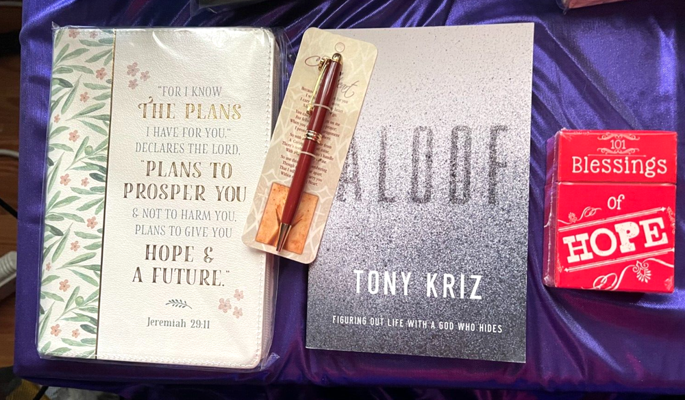 BUY ONE ITEM (SET) AT THE REGULAR PRICE & THE 2ND ITEM IS `10% OFF, BUY A 3RD ITEM (SET) IT IS 15% OFF PRICE, BUY A 4th item or set and you will receive 20% off Gift Set 4 Items: 1. Journal with scriptures/Zipper - Jeremiah 29:11, 2. Book- ALOOF, Finding our life with a God that hides , 3. Twist Ink Pen with bookmark attached. -- A Caring Heart, 4. Box of Blessings of Hope - 101 colorful prayer and meditation Cards 1. For I Know The Plans Zipper Journal Product Description Faux leather gift journal with debossed design and wrap around zip closure Art and designer lettering; inspiring design 336 lined pages with Scripture Ribbon marker 8.75" x 6.5" "For I know the plans I have for you" declares the Lord. Plans to prosper you and not to harm you. Plans to give you hope and a future" Jeremiah 29:11 Patterned border design Product Information Title: For I Know The Plans Zipper Journal Format: Gift Number of Pages: 336 Vendor: Christian Art Gifts Publication Date: 2021 Weight: 1 pound 4 ounces ISBN-13: 9781642725926 Stock No: WW725929 Retail price: $19.99 2. Twist Ink Pen - A Caring Heart with attached bookmark 3. Book: Aloof: Finding Our Life with a God That Hides Product Description Written in an authentic, conversational style, Aloof tiptoes the fragile edge where profound musing meets untamed storytelling. This book will help you process how God acts uniquely toward us, depending upon each stage of life. It includes real-life stories that normalize the experience of an often hidden God, while also aiding the reader to acknowledge the very real moments (rare though they may be) when God shows up in tangible ways. Product Information Title: Aloof: Figuring Out Life with a God Who Hides By: Tony Kriz Format: Paperback Number of Pages: 256 Vendor: W Publishing Publication Date: 2014 Dimensions: 8.38 X 5.50 (inches) Weight: 8 ounces ISBN: 0849947405 ISBN-13: 9780849947407 Publisher's Description "God, are you there?" is a near universal cry of the human heart. We have all longed for God to be tangible. Some might sway to worship music, others go on missions, others fast from food. The universal quest is to feel the divine . . . and yet the divine seems aloof, even shy. In this narrative-driven book, Tony Kriz leads the reader on a journey of “orchestrated epiphanies” along the eternal quest to tangibly encounter God, including the unpredictable moments that give us hope, and even more so, the long gaps between those moments that challenge our faith. Written in an authentic, conversational style, Aloof is easily accessible to those who don’t know much about the Bible, yet the message is still theologically informed and culturally relevant. This book will help you process how God acts uniquely towards us, depending upon each stage of life. The chapters include contemporary real-life stories that normalize the experience of an often hidden God, while also aiding the reader to acknowledge the very real moments (rare though they may be) when God has shown up in a tangible way. Dimensions: 8.38 X 5.50 (inches) Weight: 8 ounces ISBN: 0849947405 ISBN-13: 9780849947407 4. 101 Prayer Cards - Blessings of Hope. Sealed in plastic wrap from factory Product Description Each card in this deck of 51 contains special inspiration and blessings of Hope. Featuring one on each side, and packed in sturdy storage box, it's a pick-me-up gift sure to encourage for any occasion or every day giving. Glossy card stock; box size 3.75" x 2.5". Product Information Title: 101 Blessings of Hope Format: Gift Vendor: Christian Art Gifts Publication Date: 2013 Weight: 4 ounces UPC: 6006937115811