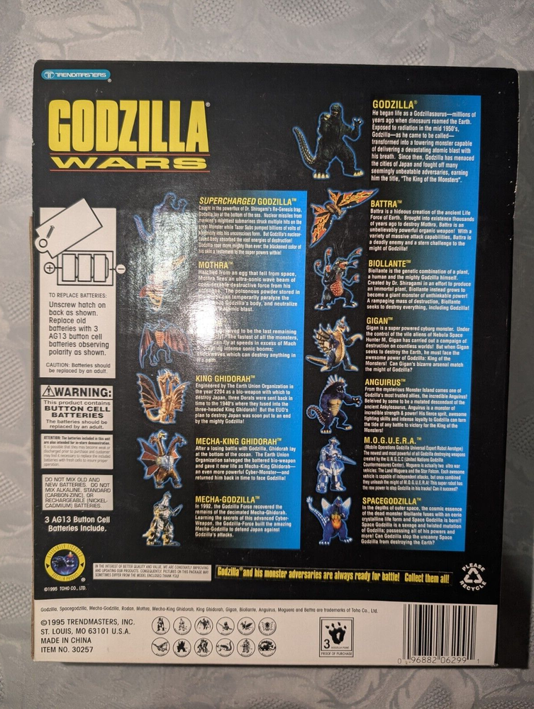 The product is a Gigon Trendsetters Godzilla Wars toy released by Trendmasters in 1995. It is a Godzilla-themed toy recommended for ages 4 and up. The toy is still in its original box, unopened, and i...