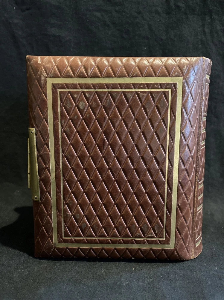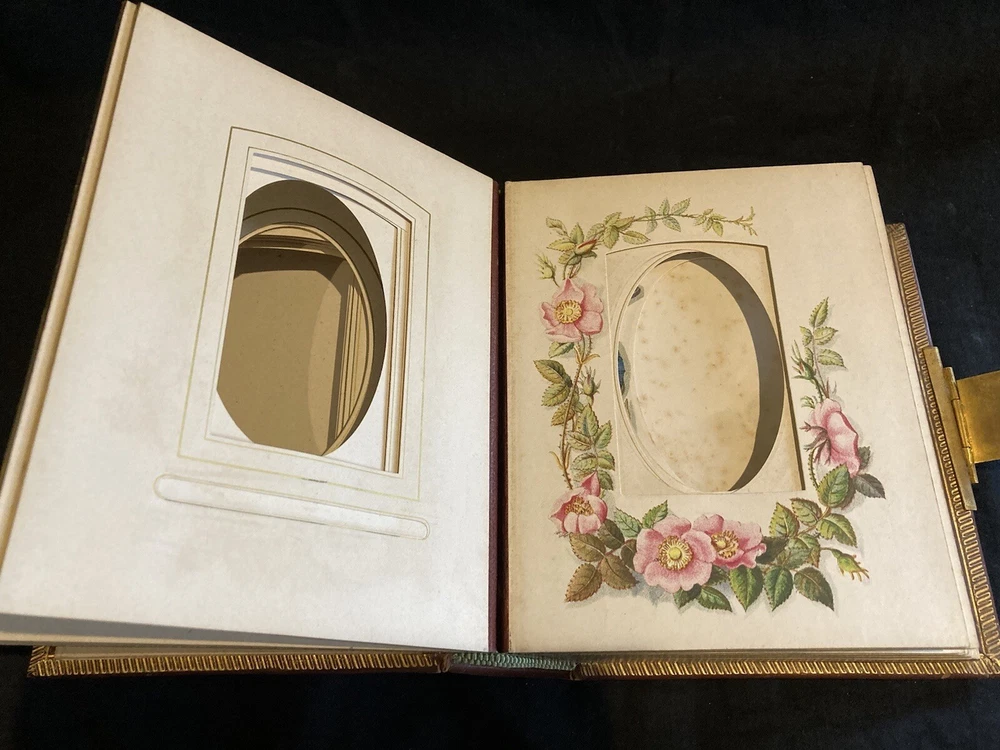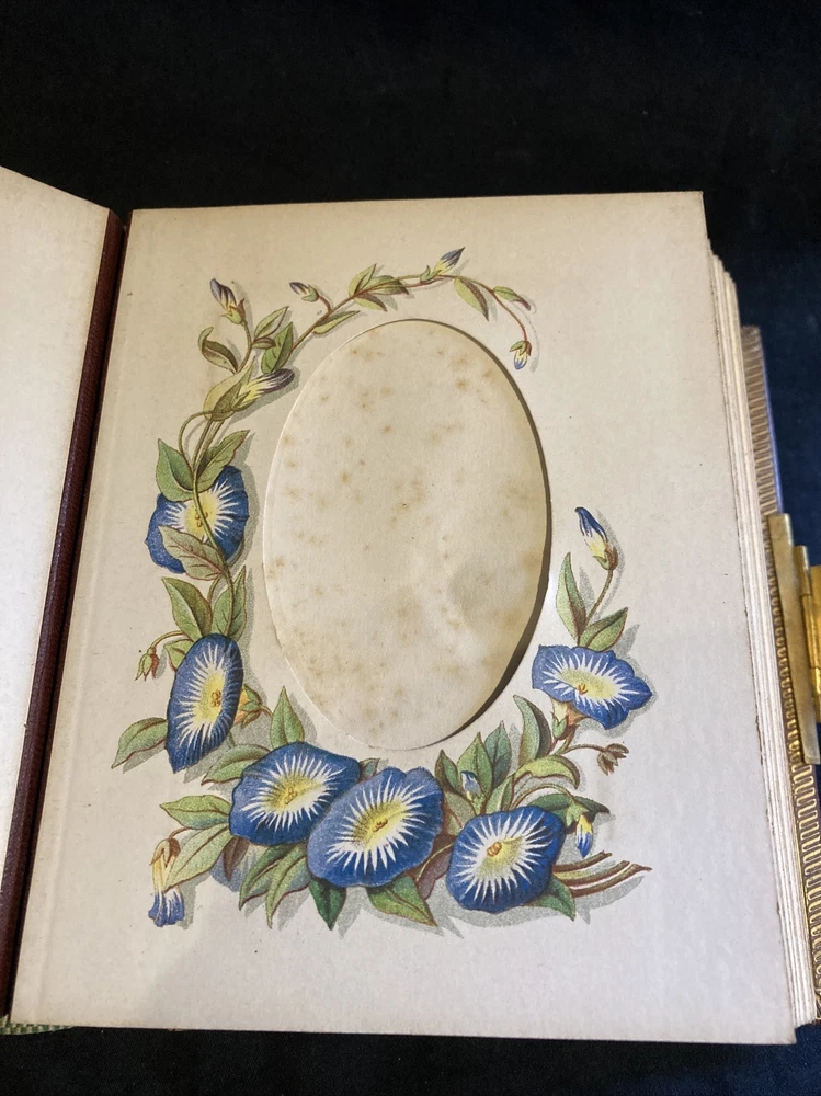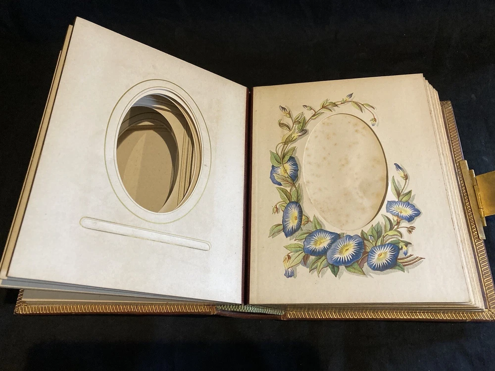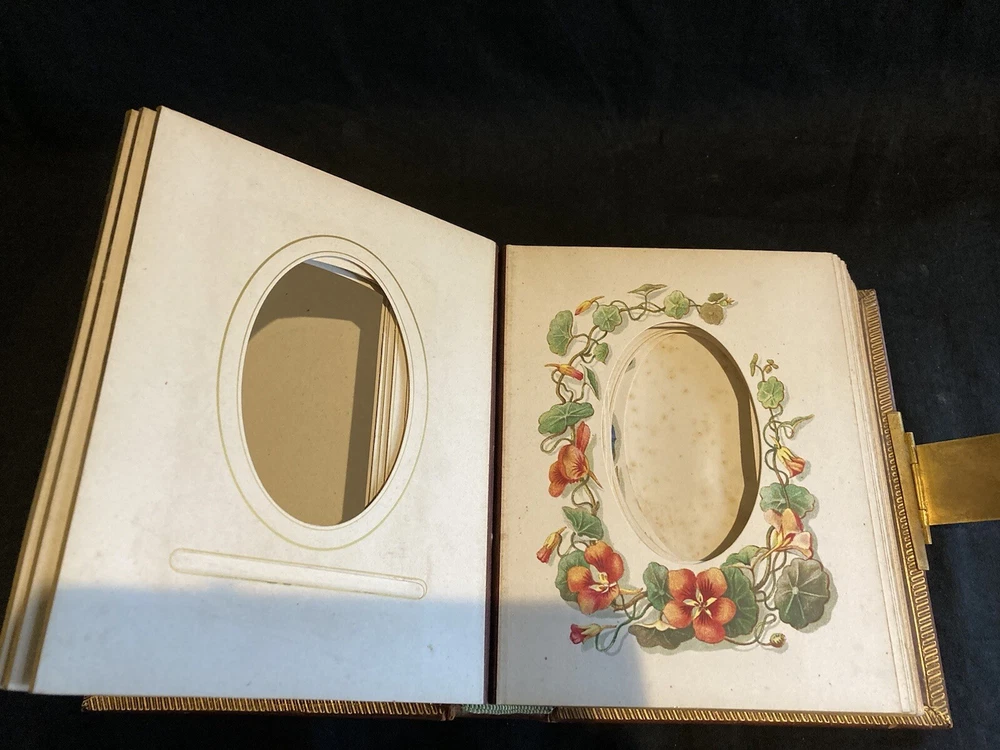 This beautiful gilt edge leather bound portrait album from 1880 is with a brass clasp (damaged see picture) empty with floral decoration some mould marks as shown, binding damage as in picture.. This album is still in Superb condition for its age a beautiful addition to any collection or library or simply as a family album for someone who loves their gardening. Inscribed as shown and dated 1880.