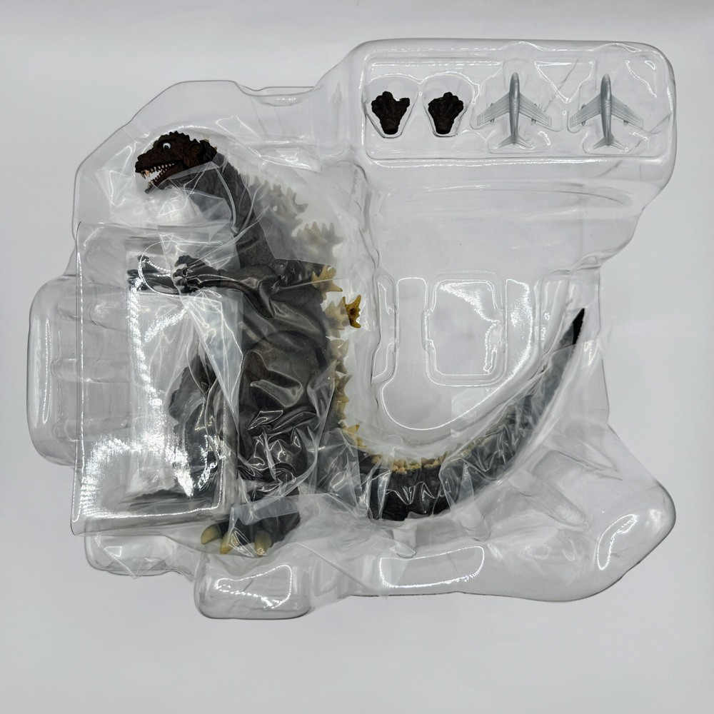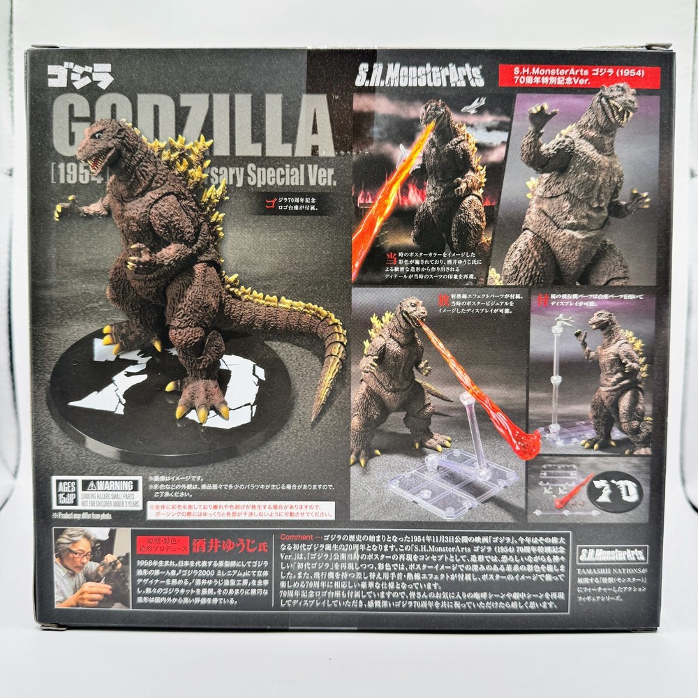 To commemorate the 70th anniversary of "Godzilla," "Godzilla (1954)" is now available in its original poster coloring as an S.H.MonsterArts! The figure has been sculpted and colored by Yuuji Sakai, the leading Godzilla sculptor. The figure is painted in the image of the movie posters of the time, and the intricate details recreate the impression of the suit from that time. By using the interchangeable left and right wrist parts, it is possible to hold the included airplane. In addition, a radiation heat ray effect is included, so you can enjoy displaying it in the image of the poster. In addition, a "Godzilla 70th Anniversary Logo Pedestal" is included to commemorate the 70th anniversary of "Godzilla". Set Contents: * Main body * Interchangeable hand parts (L/R) * Radiation heat ray effect parts * Airplane parts x 2 * Stand