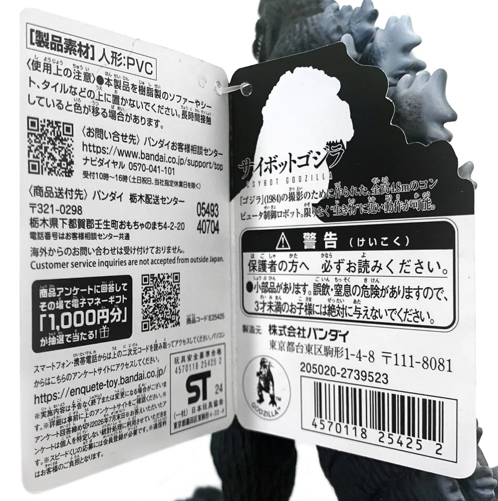 GODZILLA (1984) CYBOT BANDAI LIMITED MOVIE MONSTER SERIES 6.5-INCH VINYL FIGURE Exclusive Movie Monster Series figure is based on the 16 foot tall robotic Godzilla with movable parts (eyes, mouth, snout) created for close-up special effect shots in the 1984 Toho film Return of Godzilla. Cybot Godzilla stands approx. 6.5” tall x 9.5” long and features movable arms and legs. BRAND NEW with Hangtag.