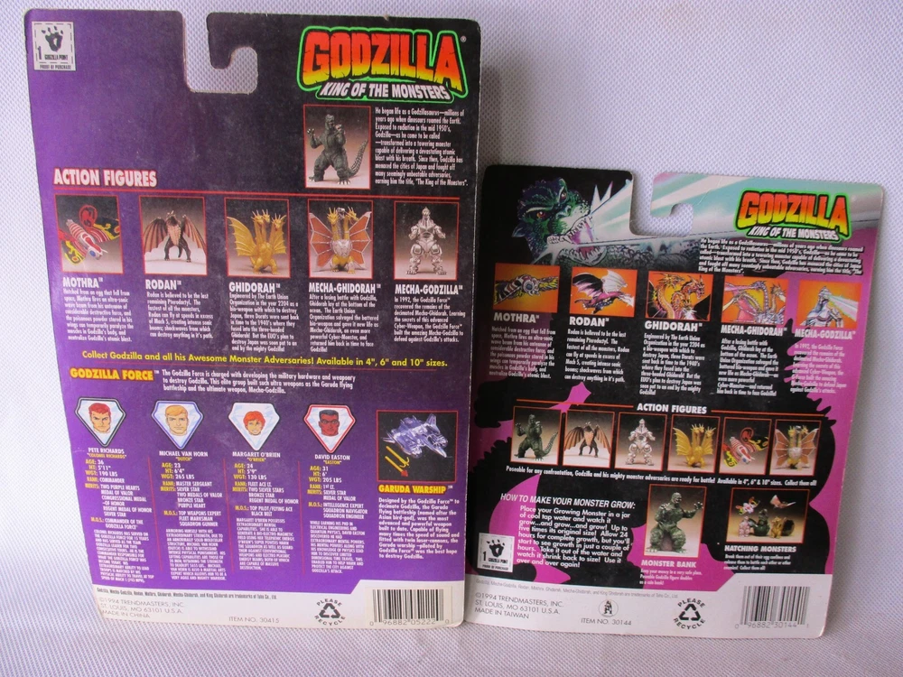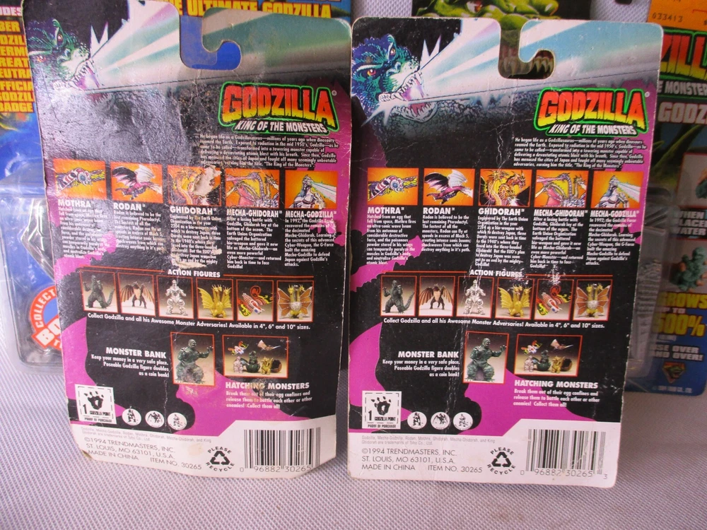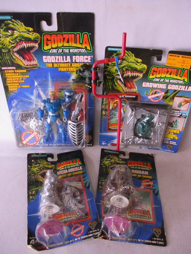Godzilla 1994 Trendmasters LOT Mecha, Rodan Jump Up, Growing, Michael Van Horn Force, All carded original figures, Mecha Godzilla Jump Up, Rodan Jump Up, Growing Godzilla and a Godzilla Force Michael Van Horn. The Van Horn card is in great shape with a little storage wear, the Growing Godzilla is VG with a nice vintage Toys R Us sticker, the Jump Up figures have some creases and stains, dennts to the bubbles and would really look better just opened up, Also includes a Fun Straw by Trendmasters as well, excellent conditon but not carded, nice vintage lot of toys. 501598 Hi! And thanks for looking. Hope I can send something good your way. I pack items with care and work my best to get items to you in the best of condition. I have been collecting for over 30 years and do my best to describe everything as well as possible. If I missed something feel free to ask.