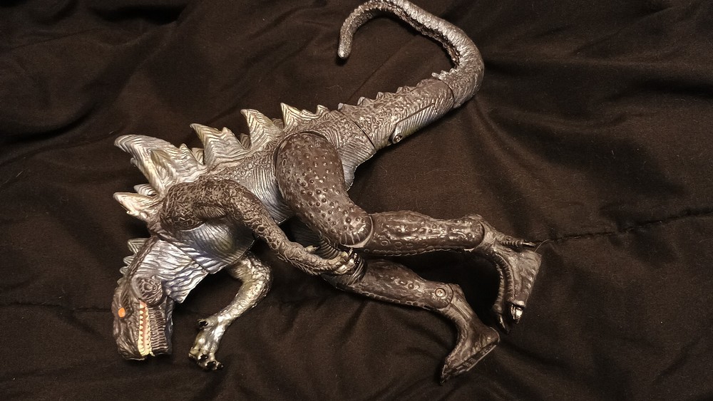 Godzilla Figure. From Trendmasters. 1998. As far as I can tell, this is the Fang Bite figure, even though it doesn't have the chest button the packaging claims, but I can't find a figure with the same design. If this is a different figure, feel free to correct me. No packaging. Needs new batteries to roar, but nothing broken. Great collectors item. Enjoy!