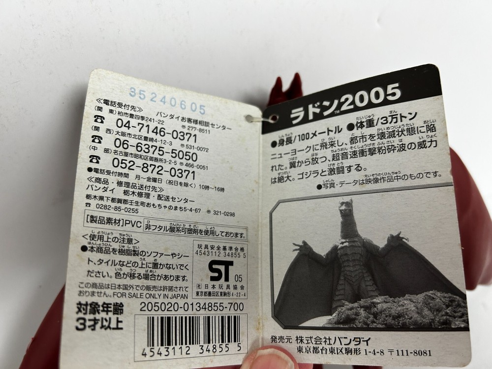 Godzilla Final Wars RODAN 6" Vinyl Figure Bandai 2005 w/ Tag UPC 4543112348555 For Sale Only In Japan. In fantastic condition from smoke free pet free home Check out the other vintage Godzilla items I have listed! Please mouse over and zoom in on all hi-res photos! This item will be packaged VERY well. Payment is due within 24-48 hours purchase. If this doesn't work for you, please message me before you buy for approval. Unless other arrangements have been made, transaction will be cancelled due to buyer non-payment at the end of the 4th day.