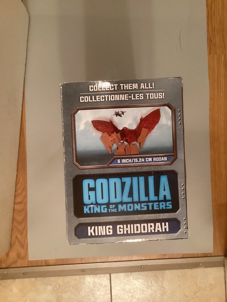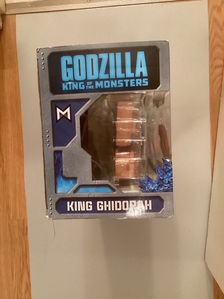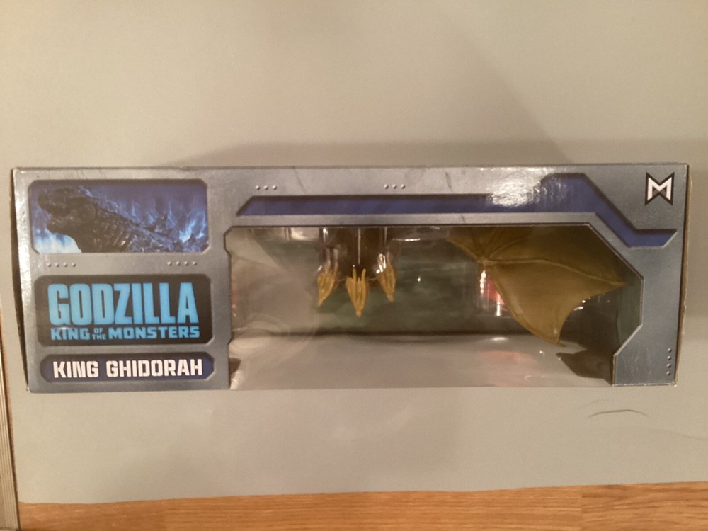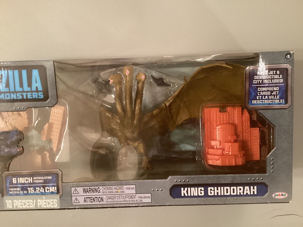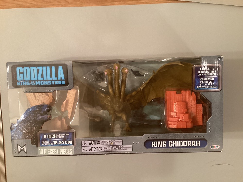 2019 Godzilla King of the Monsters Ghidorah action figure with Argo Jet & destructible city. Brand new; in box. Package is 16” x 7”. Brand is Jakks.